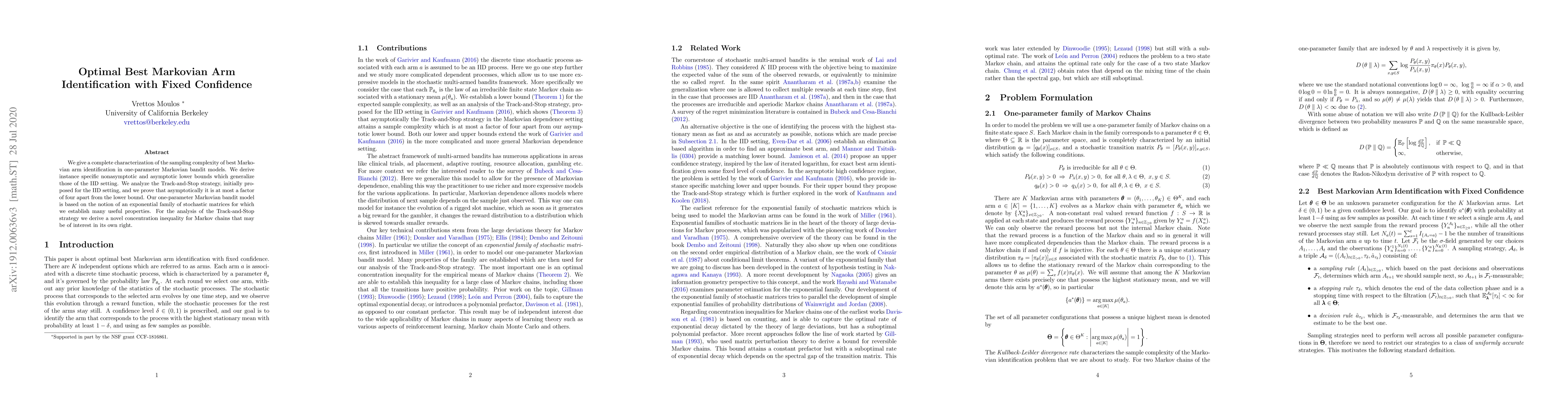 This research paper provides lower bounds for the optimal sampling complexity of best Markovian arm identification in bandit models, and analyzes a specific strategy called Track-and-Stop, showing it is asymptotically close to the optimal bound with a factor of four.