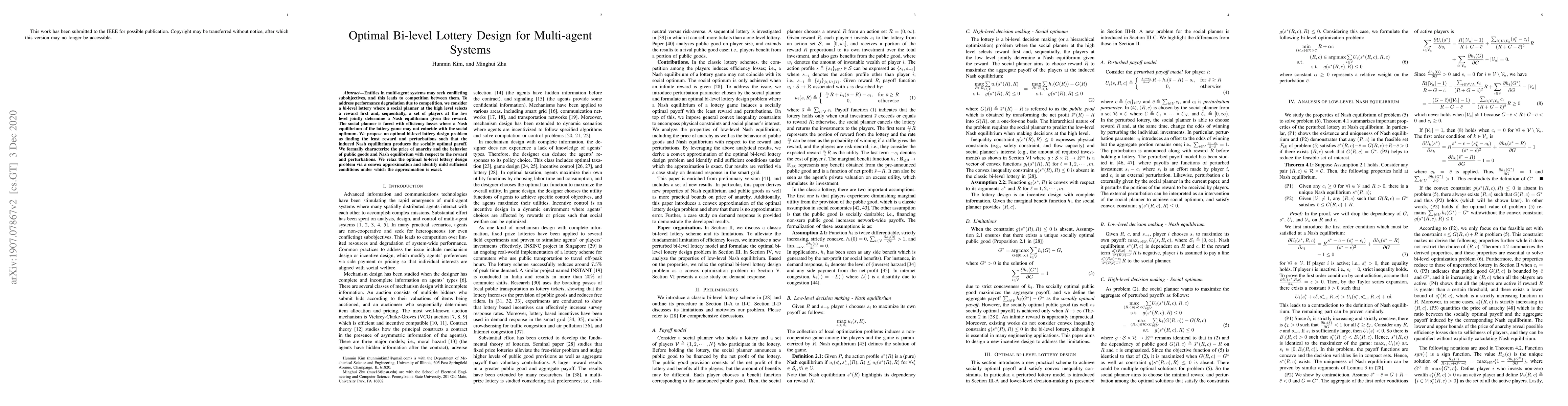 Entities in multi-agent systems may seek conflicting subobjectives, and this leads to competition between them. To address performance degradation due to competition, we consider a bi-level lottery where a social planner at the high level selects a reward first and, sequentially, a set of players at the low level jointly determine a Nash equilibrium given the reward. The social planner is faced with efficiency losses where a Nash equilibrium of the lottery game may not coincide with the social optimum. We propose an optimal bi-level lottery design problem as finding the least reward and perturbations such that the induced Nash equilibrium produces the socially optimal payoff. We formally characterize the price of anarchy and the behavior of public goods and Nash equilibrium with respect to the reward and perturbations. We relax the optimal bi-level lottery design problem via a convex approximation and identify mild sufficient conditions under which the approximation is exact.
