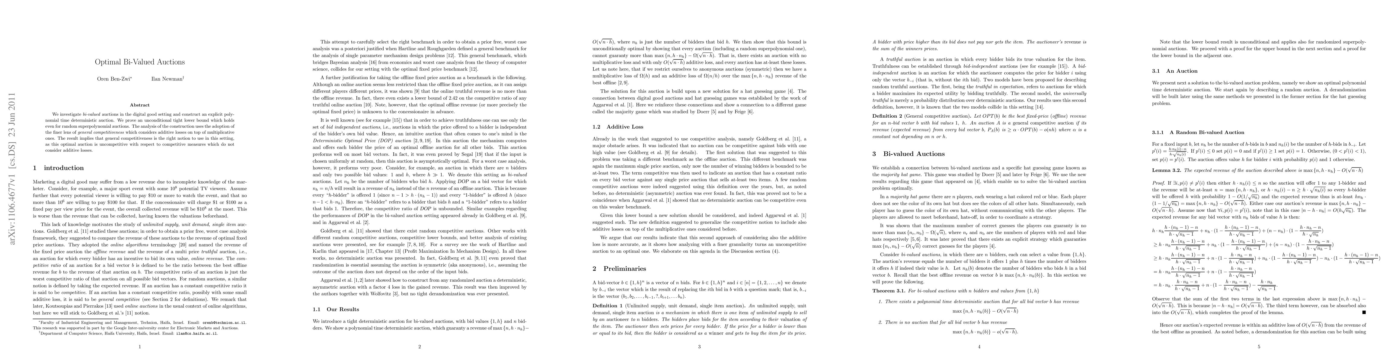 This paper constructs an optimal polynomial time deterministic auction for bi-valued digital goods, proving a tight lower bound even for random superpolynomial auctions. It argues that general competitiveness, which accounts for both additive and multiplicative losses, is the appropriate metric for evaluating such auctions.