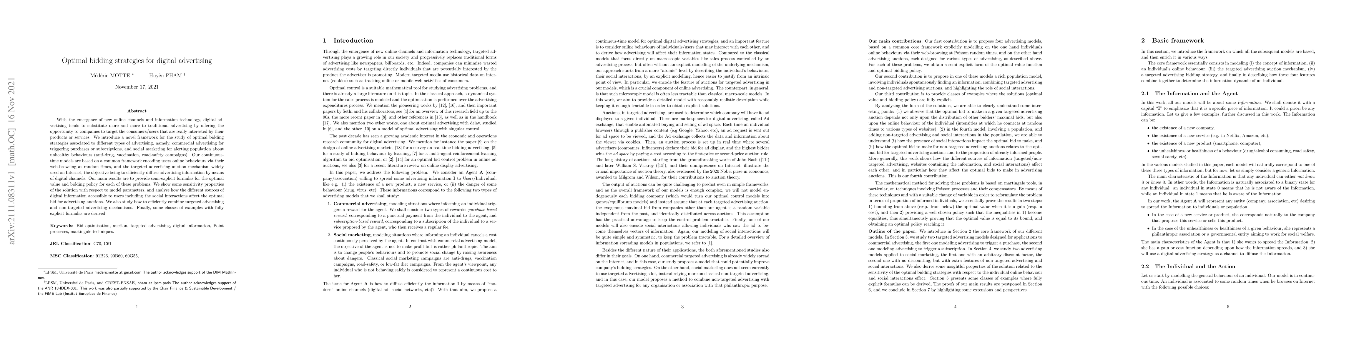 This paper presents a novel framework for optimal bidding strategies in digital advertising, focusing on commercial and social marketing campaigns. It provides semi-explicit formulas for optimal values and bidding policies, analyzes the impact of digital information sources, and explores the combination of targeted and non-targeted advertising mechanisms.