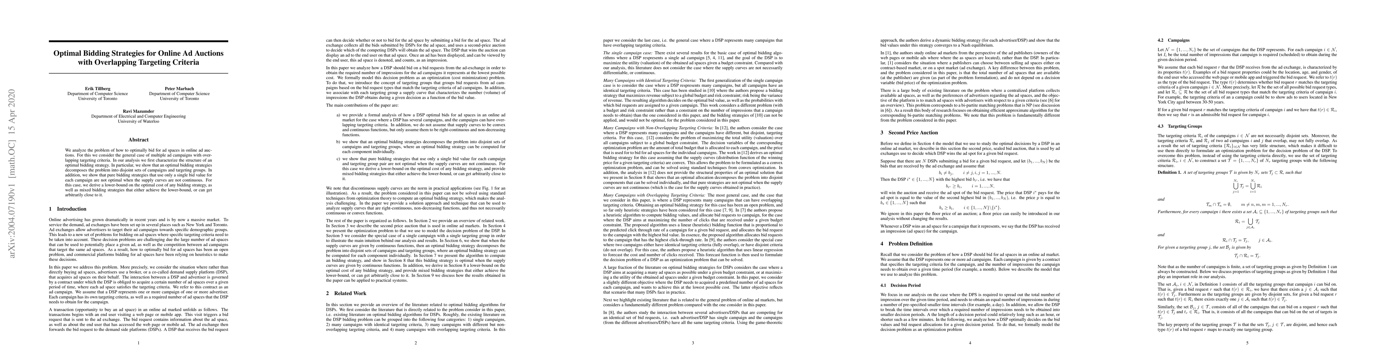 This paper explores optimal bidding strategies for online ad auctions involving multiple campaigns with overlapping targeting criteria. It demonstrates that optimal strategies decompose the problem into disjoint sets and shows that pure single-bid strategies are suboptimal when supply curves are not continuous, proposing mixed strategies that achieve or closely approximate the derived lower-bound on optimal costs.