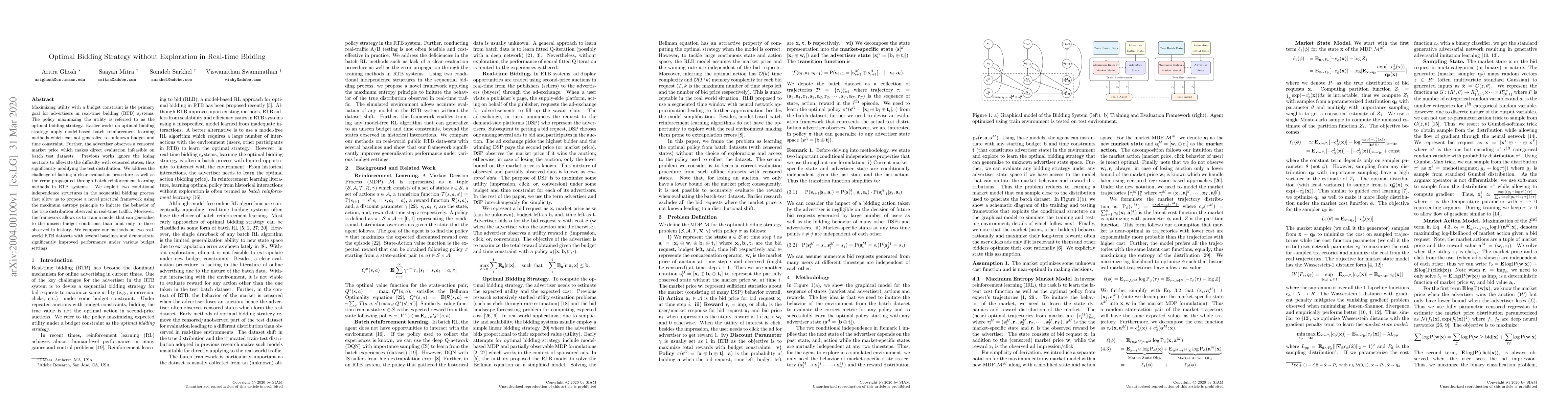 This paper proposes a novel framework for optimal bidding strategies in real-time bidding systems, addressing the lack of evaluation procedures and generalization issues of previous batch reinforcement learning methods. The framework leverages conditional independence structures and maximum entropy principles to improve performance under unseen budget conditions.