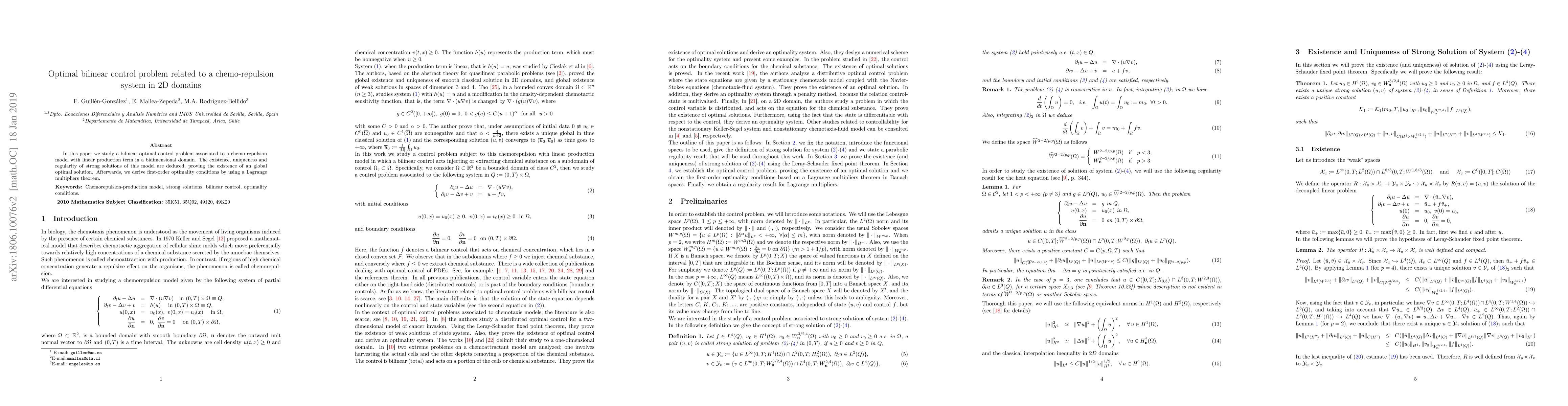 In this paper we study a bilinear optimal control problem associated to a chemo-repulsion model with linear production term. We analyze the existence, uniqueness and regularity of pointwise strong solutions in a bidimensional domain. We prove the existence of an optimal solution and, using a Lagrange multipliers theorem, we derive first-order optimality conditions.