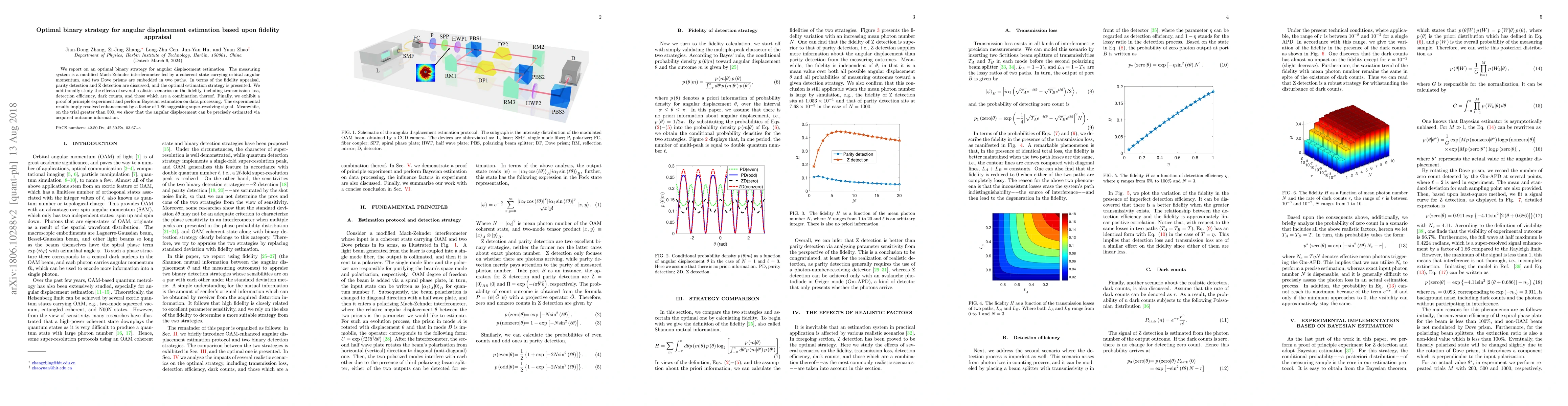 We report on an optimal binary strategy for angular displacement estimation. The measuring system is a modified Mach-Zehnder interferometer fed by a coherent state carrying orbital angular momentum, and two Dove prisms are embedded in two paths. In terms of the fidelity appraisal, parity detection and Z detection are discussed, and the optimal estimation strategy is presented. We additionally study the effects of several realistic scenarios on the fidelity, including transmission loss, detection efficiency, dark counts, and those which are a combination thereof. Finally, we exhibit a proof of principle experiment and perform Bayesian estimation on data processing. The experimental results imply resolved enhancement by a factor of 1.86 suggesting super-resolving signal. Meanwhile, on the trial greater than 500, we show that the angular displacement can be precisely estimated via acquired outcome information.