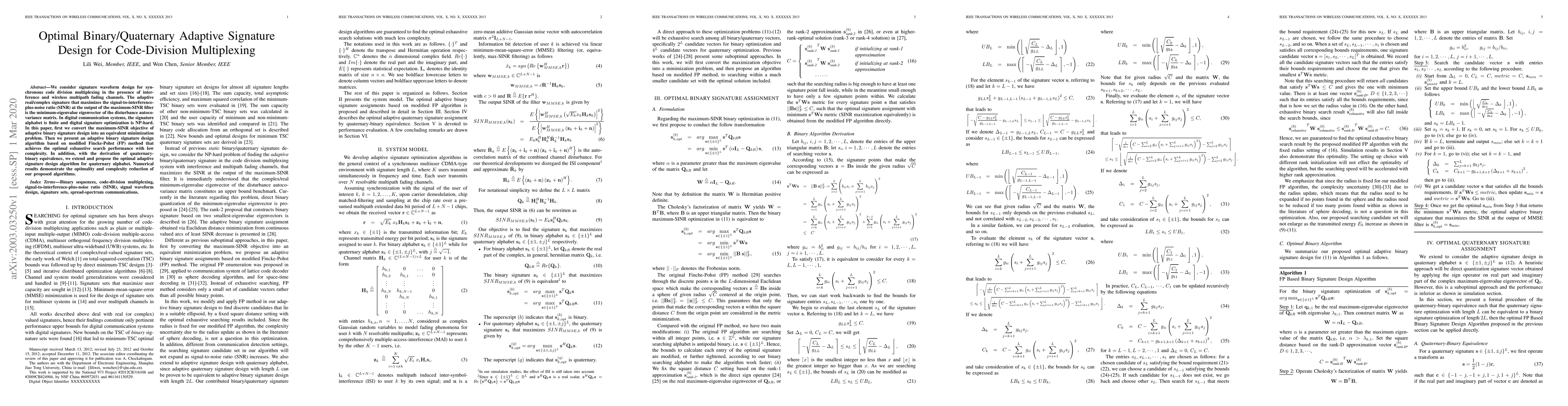 This paper proposes adaptive binary and quaternary signature design algorithms for optimal performance in code-division multiplexing systems, addressing interference and multipath fading. The algorithms achieve optimal signal-to-interference-plus-noise ratio with reduced complexity compared to exhaustive search methods.