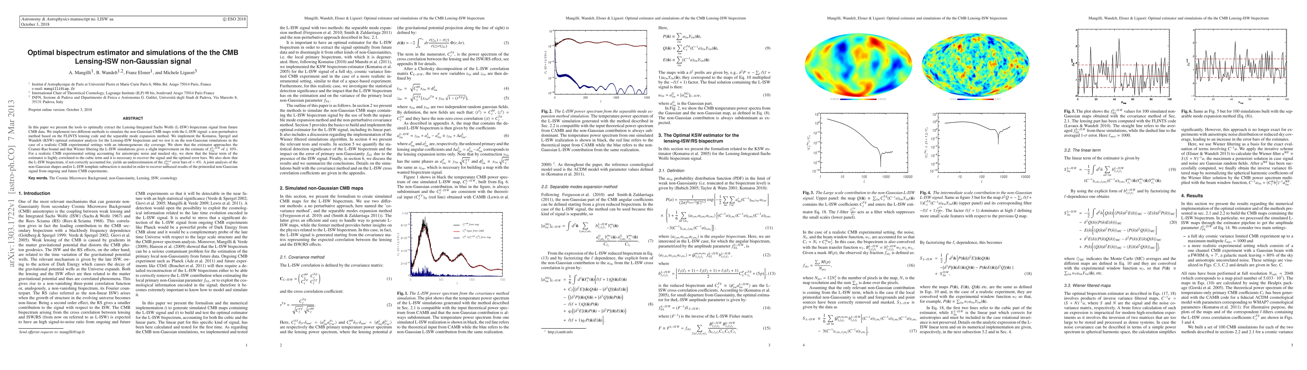 In this paper we present the tools to optimally extract the Lensing-Integrated Sachs Wolfe (L-ISW) bispectrum signal from future CMB data. We implement two different methods to simulate the non-Gaussian CMB maps with the L-ISW signal: a non-perturbative method based on the FLINTS lensing code and the separable mode expansion method. We implement the Komatsu, Spergel and Wandelt (KSW) optimal estimator analysis for the Lensing-ISW bispectrum and we test it on the non-Gaussian simulations in the case of a realistic CMB experimental settings with an inhomogeneous sky coverage. We show that the estimator approaches the Cramer-Rao bound and that Wiener filtering the L-ISW simulations gives a slight improvement on the estimate of $f_{NL}^{L-ISW}$ of $\leq 10%$. For a realistic CMB experimental setting accounting for anisotropic noise and masked sky, we show that the linear term of the estimator is highly correlated to the cubic term and it is necessary to recover the signal and the optimal error bars. We also show that the L-ISW bispectrum, if not correctly accounted for, yields an underestimation of the $f_{NL}^{local}$ error bars of $\simeq 4%$. A joint analysis of the non-Gaussian shapes and/or L-ISW template subtraction is needed in order to recover unbiased results of the primordial non-Gaussian signal from ongoing and future CMB experiments.