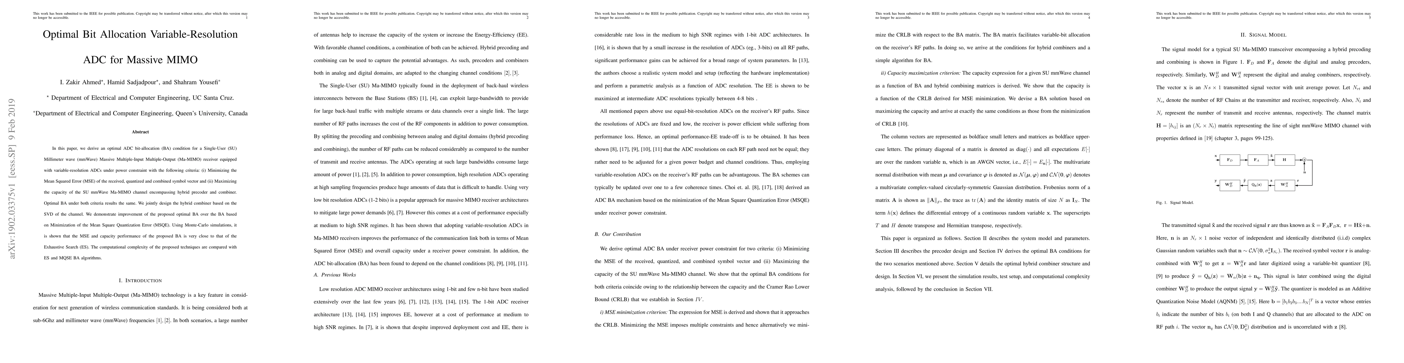 This paper proposes an optimal bit allocation method for a Single-User mmWave Massive MIMO receiver with variable-resolution ADCs, aiming to minimize Mean Squared Error and maximize channel capacity under power constraints. The derived optimal bit allocation closely matches performance with exhaustive search methods while reducing computational complexity.