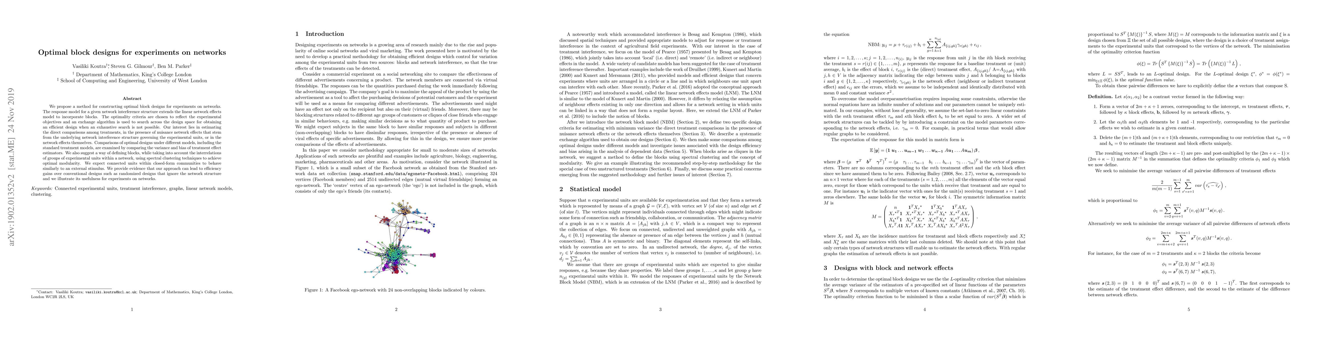 This paper proposes a method for constructing optimal block designs for experiments on networks, using an exchange algorithm to achieve efficient designs. It focuses on estimating direct comparisons among treatments while accounting for network interference, leveraging spectral clustering for defining blocks and demonstrating efficiency gains over conventional randomized designs.