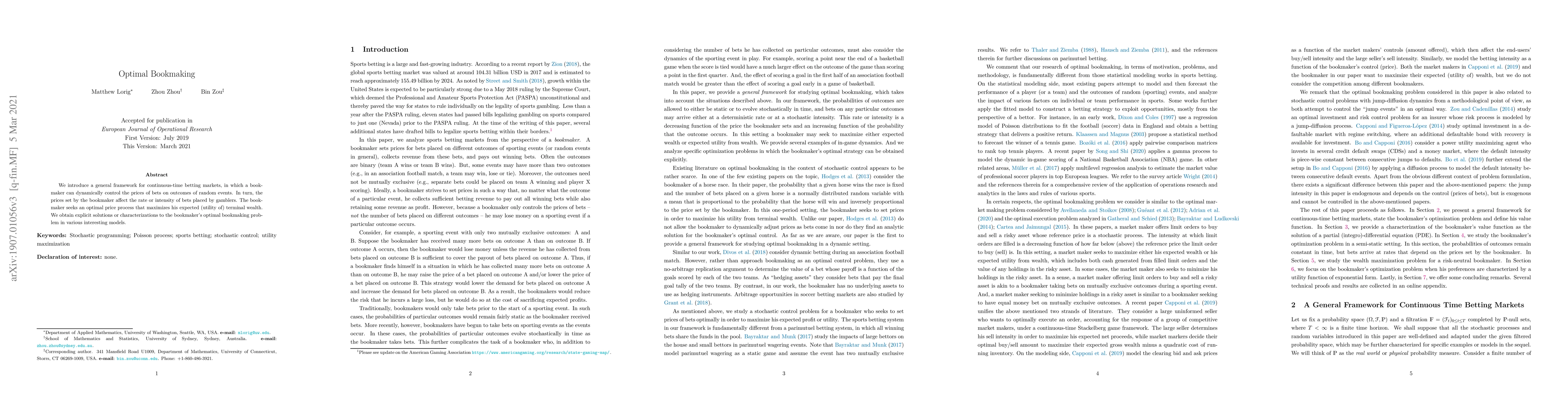 Researchers developed a framework for bookmakers to control bet prices and maximize their expected wealth, finding explicit solutions in various models. This framework can help bookmakers make informed decisions about betting odds.
