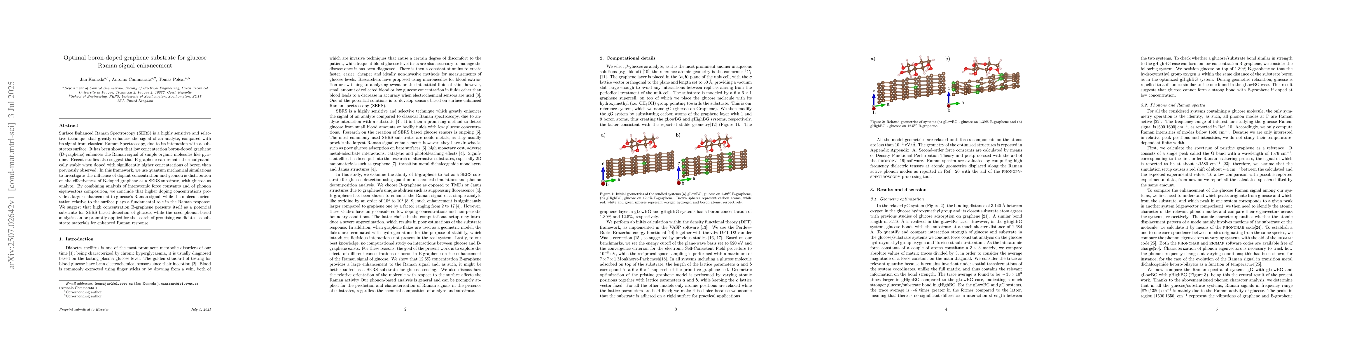 This research uses quantum simulations to find that higher boron concentrations in graphene enhance glucose Raman signals, with molecule orientation crucial for Raman response. It suggests high B-graphene concentration as a promising SERS substrate for glucose detection.