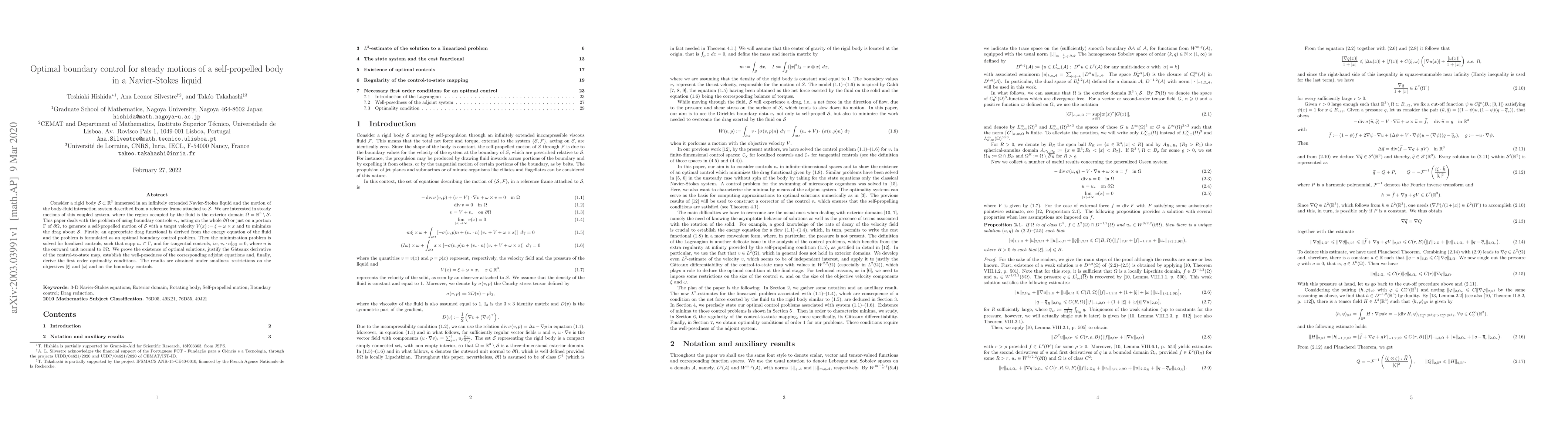 Consider a rigid body ${\mathcal S} \subset {\mathbb R}^3$ immersed in an infinitely extended Navier-Stokes liquid and the motion of the body-fluid interaction system described from a reference frame attached to ${\mathcal S}$. We are interested in steady motions of this coupled system, where the region occupied by the fluid is the exterior domain $\Omega = {\mathbb R}^3 \setminus {\mathcal S}$. This paper deals with the problem of using boundary controls $v_*$, acting on the whole $\partial\Omega$ or just on a portion $\Gamma$ of $\partial\Omega$, to generate a self-propelled motion of ${\mathcal S}$ with a target velocity $V(x):=\xi+\omega \times x$ and to minimize the drag about ${\mathcal S}$. Firstly, an appropriate drag functional is derived from the energy equation of the fluid and the problem is formulated as an optimal boundary control problem. Then the minimization problem is solved for localized controls, such that supp $v_*\subset \Gamma$, and for tangential controls, i.e, $v_*\cdot n|_{\partial \Omega}=0$, where $n$ is the outward unit normal to $\partial \Omega$. We prove the existence of optimal solutions, justify the G\^ateaux derivative of the control-to-state map, establish the well-posedness of the corresponding adjoint equations and, finally, derive the first order optimality conditions. The results are obtained under smallness restrictions on the objectives $|\xi|$ and $|\omega|$ and on the boundary controls.