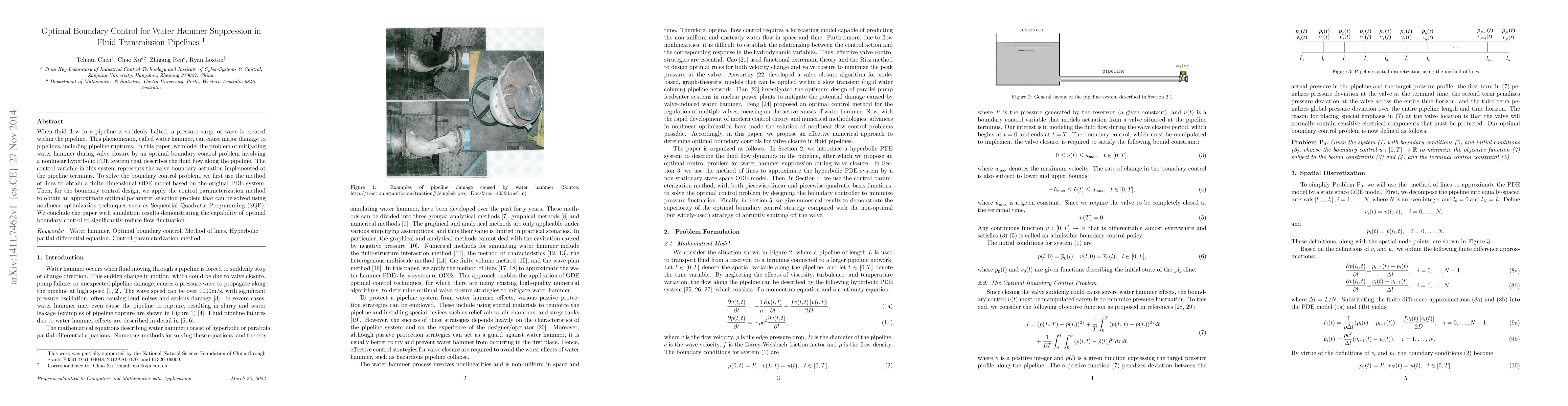 This paper models water hammer suppression in fluid transmission pipelines using an optimal boundary control approach. It employs a nonlinear hyperbolic PDE system and applies the method of lines to derive a finite-dimensional ODE model, followed by control parameterization and Sequential Quadratic Programming (SQP) for optimal parameter selection, demonstrating significant reduction in flow fluctuation through simulations.