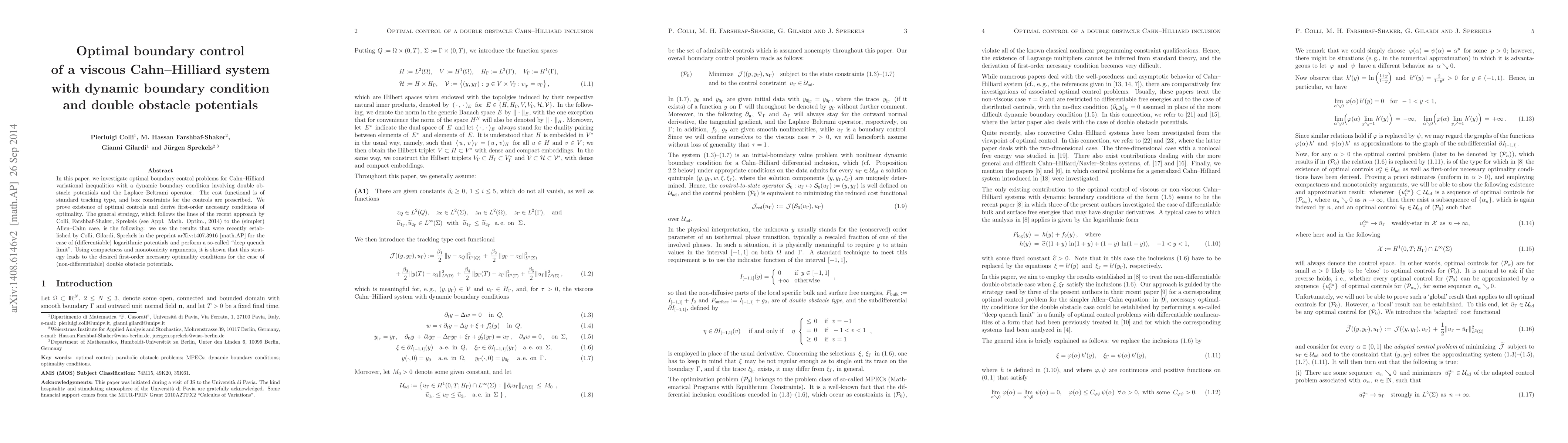 This paper studies optimal boundary control for a viscous Cahn-Hilliard system with dynamic boundary conditions and double obstacle potentials. The authors prove the existence of optimal controls and derive first-order necessary conditions, extending recent methods from the Allen-Cahn case to this more complex system.