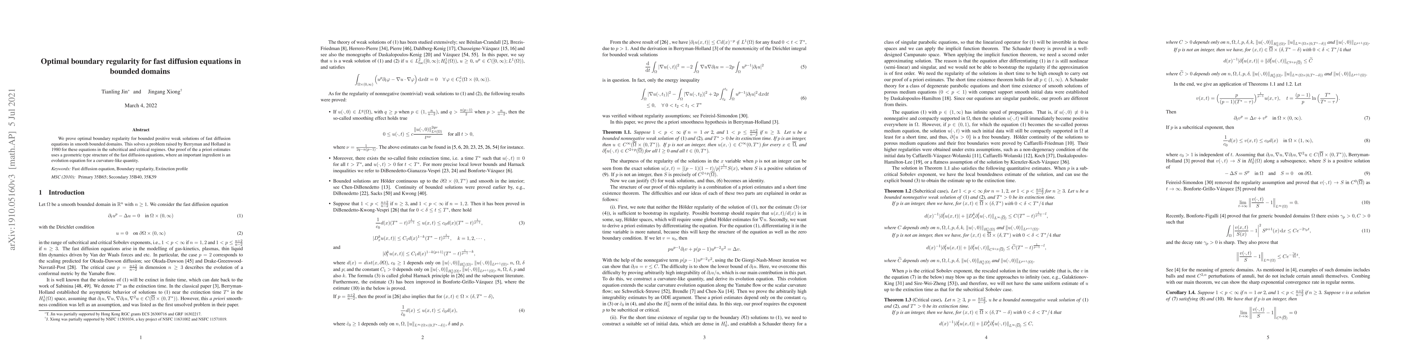 This paper proves optimal boundary regularity for positive weak solutions of fast diffusion equations in smooth bounded domains, addressing a long-standing problem posed by Berryman and Holland in 1980. The authors achieve this through a priori estimates leveraging a geometric structure involving an evolution equation for a curvature-like quantity.