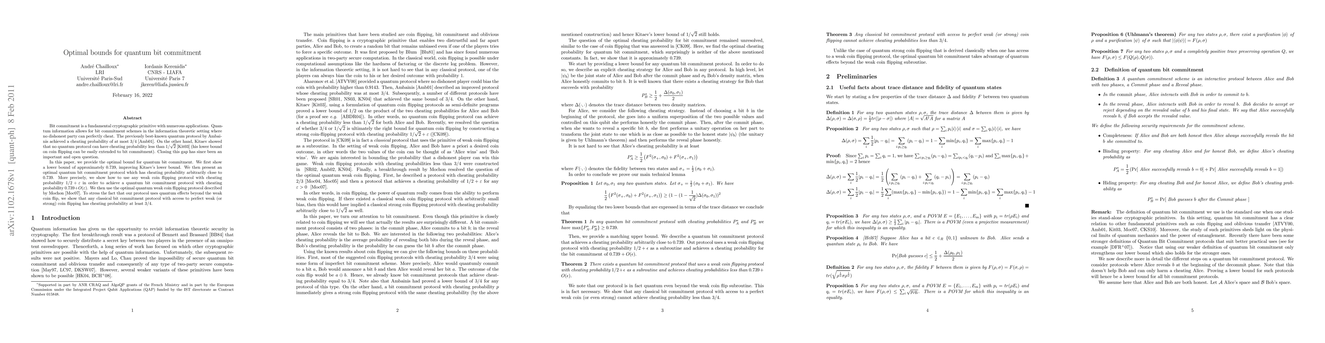 This paper establishes the optimal bound for quantum bit commitment, presenting a lower bound of approximately 0.739, surpassing Kitaev's previous lower bound. It also introduces an optimal quantum protocol achieving a cheating probability arbitrarily close to this new lower bound.