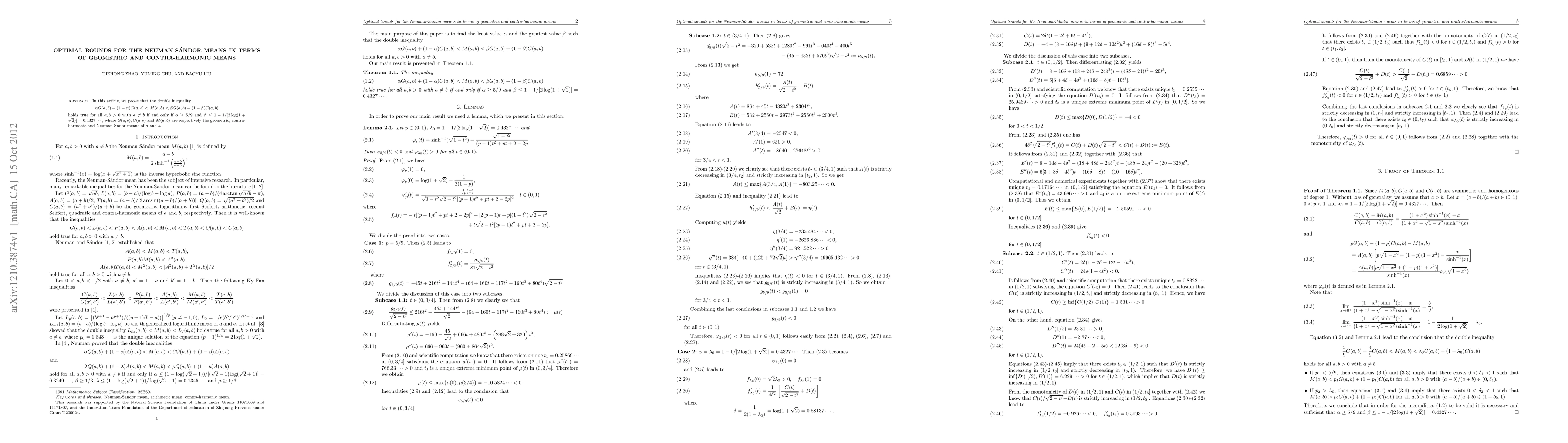 This paper establishes optimal bounds for the Neuman-Sandor mean in terms of the geometric and contra-harmonic means, proving that the inequality holds if and only if $\alpha\geq 5/9$ and $\beta\leq 0.4327$.