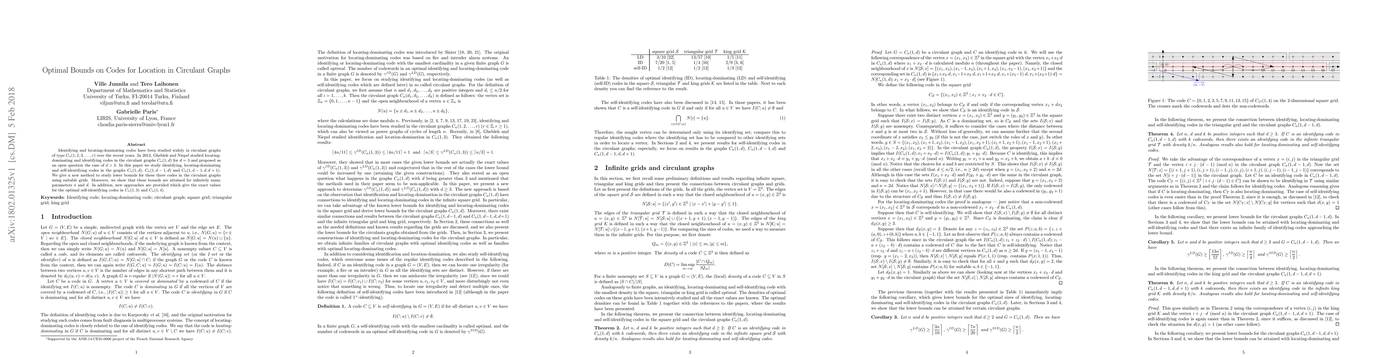 This paper investigates optimal bounds for identifying, locating-dominating, and self-identifying codes in circulant graphs $C_n(1,d)$ for various $d$. It presents a novel method using grids to establish lower bounds, demonstrating that these bounds are achieved for infinitely many $n$ and $d$. Additionally, it provides exact values for optimal self-identifying codes in specific cases.