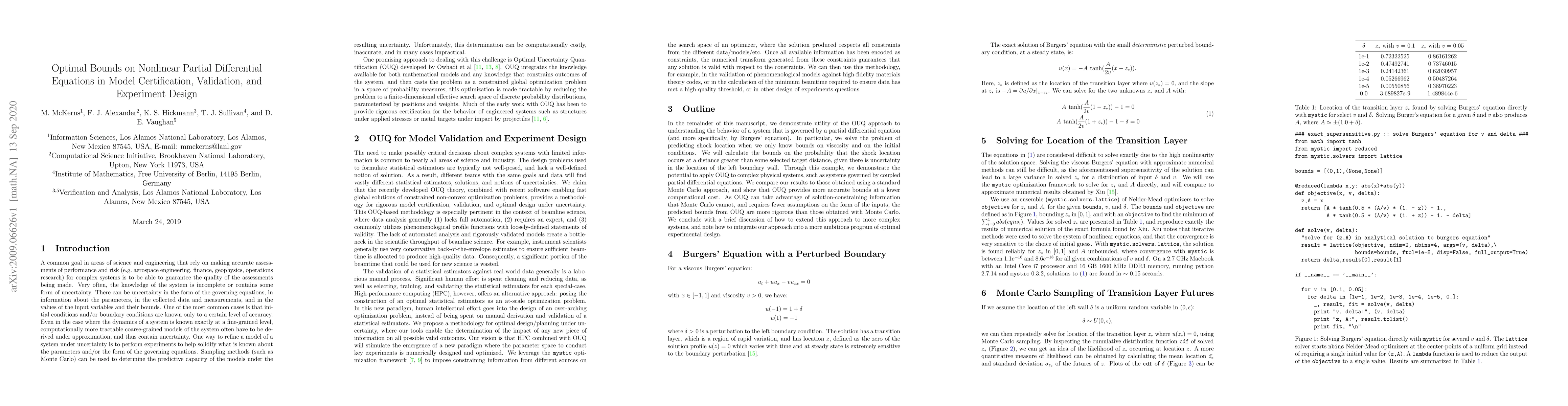 We demonstrate that the recently developed Optimal Uncertainty Quantification (OUQ) theory, combined with recent software enabling fast global solutions of constrained non-convex optimization problems, provides a methodology for rigorous model certification, validation, and optimal design under uncertainty. In particular, we show the utility of the OUQ approach to understanding the behavior of a system that is governed by a partial differential equation -- Burgers' equation. We solve the problem of predicting shock location when we only know bounds on viscosity and on the initial conditions. Through this example, we demonstrate the potential to apply OUQ to complex physical systems, such as systems governed by coupled partial differential equations. We compare our results to those obtained using a standard Monte Carlo approach, and show that OUQ provides more accurate bounds at a lower computational cost. We discuss briefly about how to extend this approach to more complex systems, and how to integrate our approach into a more ambitious program of optimal experimental design.
