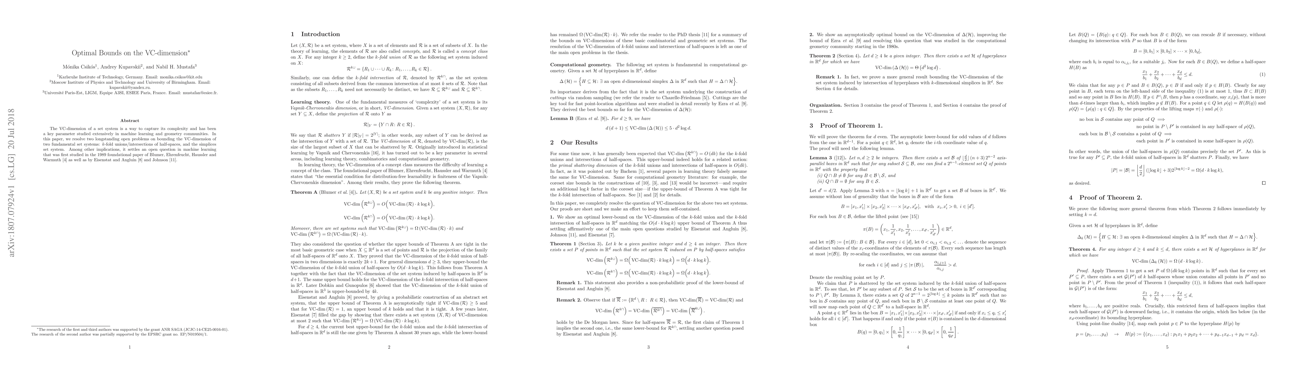 The paper presents short and self-contained proofs for optimal lower bounds on the VC-dimension of k-fold unions and intersections of half-spaces, as well as an asymptotically optimal bound on the VC-dimension of the simplices set system, resolving previously open problems in both machine learning and computational geometry.