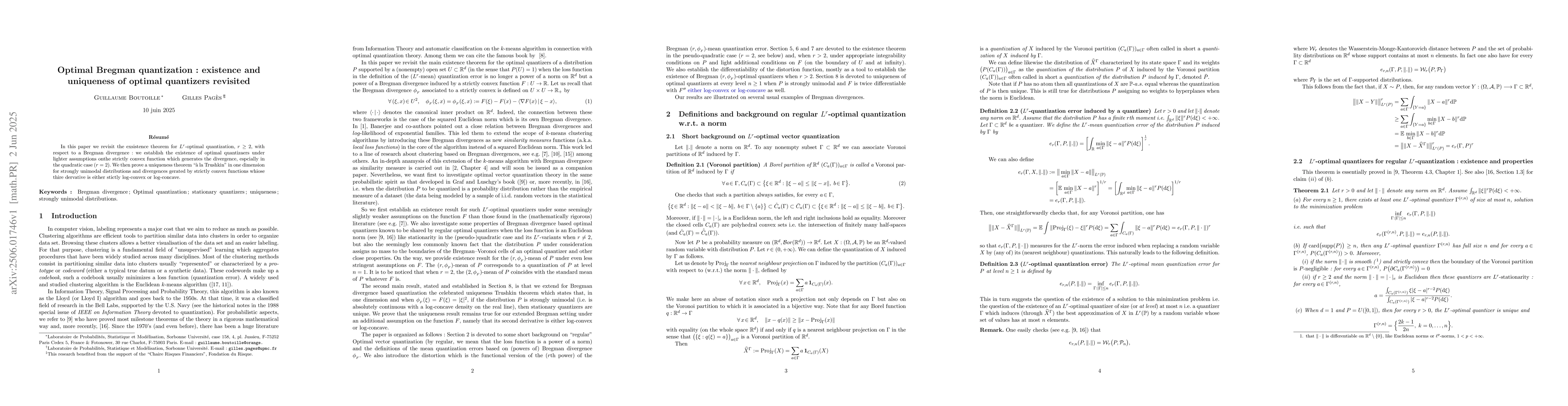 In this paper we revisit the exsistence theorem for $L^r$-optimal quantization, $r\ge 2$, with respect to a Bregman divergence: we establish the existence of optimal quantizaers under lighter assumptions onthe strictly convex function which generates the divergence, espcially in the quadratic case ($r=2$). We then prove a uniqueness theorem ``\`a la Trushkin'' in one dimension for strongly unimodal distributions and divergences gerated by strictly convex functions whiose thire dervative is either stictly $\log$-convex or $\log$-concave.
