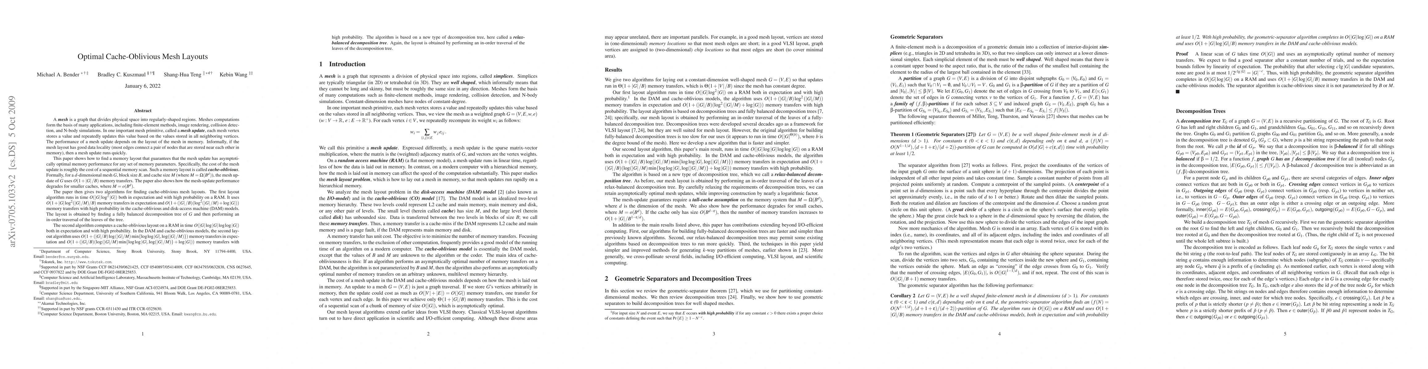 The paper presents algorithms for finding cache-oblivious mesh layouts, which guarantee optimal memory performance for mesh updates in any set of memory parameters. It introduces two algorithms: a fully balanced decomposition tree algorithm and a relax-balanced decomposition tree algorithm, both analyzed for time and memory complexity in RAM, DAM, and cache-oblivious models.