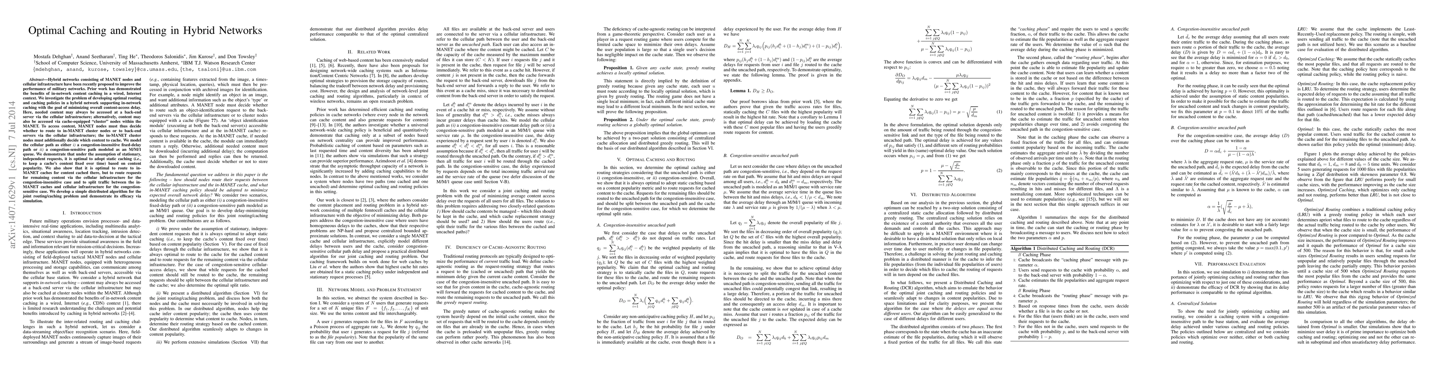Researchers investigated optimal caching and routing in hybrid networks combining MANET nodes and cellular infrastructure to minimize content-access delay. They found that static caching based on content popularity is optimal and that routes should be split between in-MANET caches and cellular infrastructure depending on congestion levels.