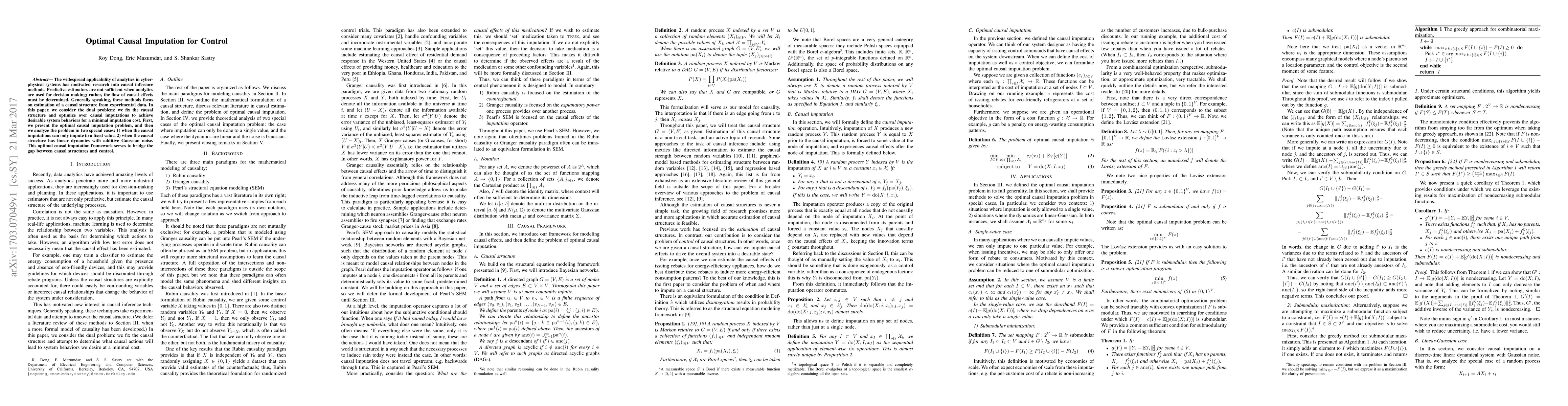 The widespread applicability of analytics in cyber-physical systems has motivated research into causal inference methods. Predictive estimators are not sufficient when analytics are used for decision making; rather, the flow of causal effects must be determined. Generally speaking, these methods focus on estimation of a causal structure from experimental data. In this paper, we consider the dual problem: we fix the causal structure and optimize over causal imputations to achieve desirable system behaviors for a minimal imputation cost. First, we present the optimal causal imputation problem, and then we analyze the problem in two special cases: 1) when the causal imputations can only impute to a fixed value, 2) when the causal structure has linear dynamics with additive Gaussian noise. This optimal causal imputation framework serves to bridge the gap between causal structures and control.