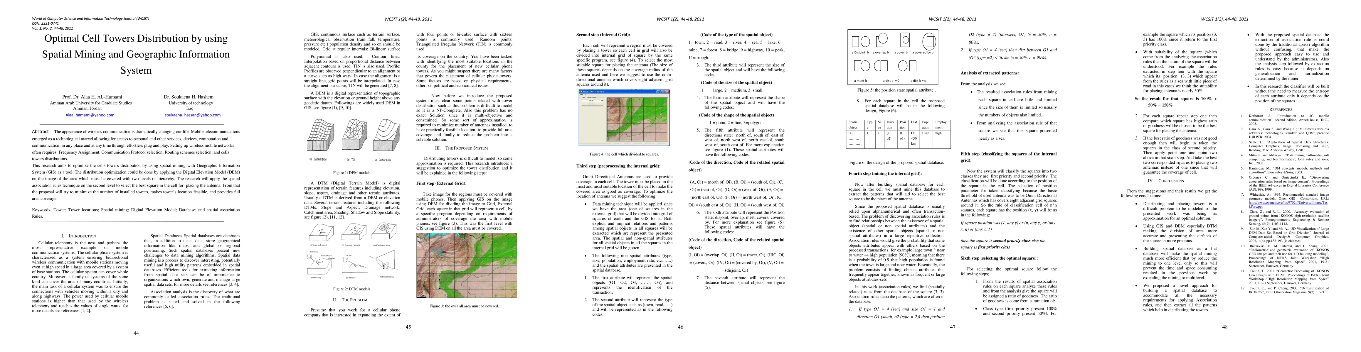 The appearance of wireless communication is dramatically changing our life. Mobile telecommunications emerged as a technological marvel allowing for access to personal and other services, devices, computation and communication, in any place and at any time through effortless plug and play. Setting up wireless mobile networks often requires: Frequency Assignment, Communication Protocol selection, Routing schemes selection, and cells towers distributions. This research aims to optimize the cells towers distribution by using spatial mining with Geographic Information System (GIS) as a tool. The distribution optimization could be done by applying the Digital Elevation Model (DEM) on the image of the area which must be covered with two levels of hierarchy. The research will apply the spatial association rules technique on the second level to select the best square in the cell for placing the antenna. From that the proposal will try to minimize the number of installed towers, makes tower's location feasible, and provides full area coverage.