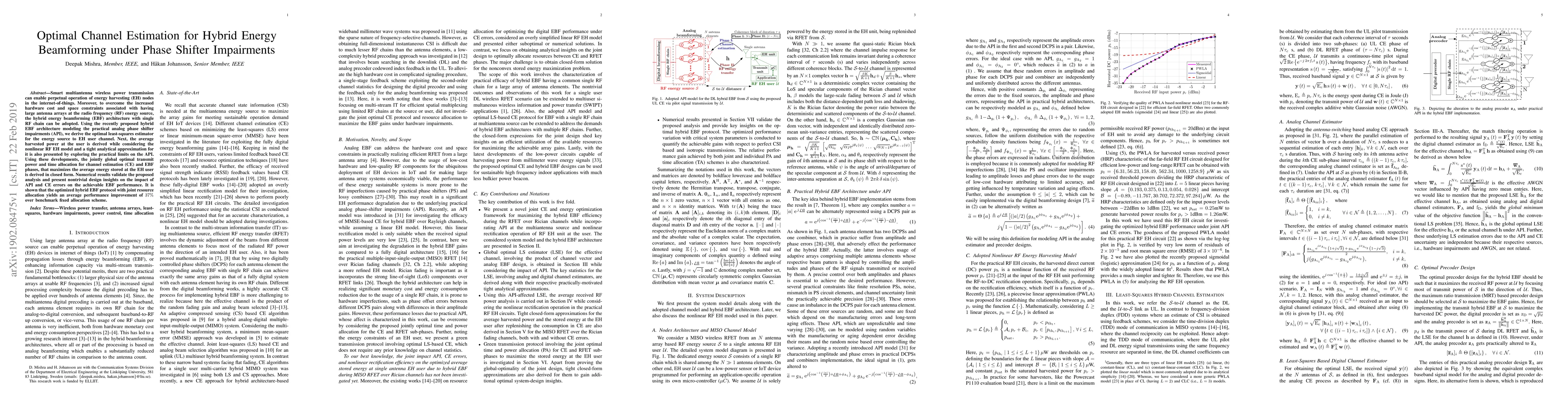 This paper proposes an optimal least-squares estimator for hybrid energy beamforming under phase shifter impairments, deriving the globally optimal transmit power and time allocation for maximizing average harvested power in energy harvesting nodes. Numerical results show a $37\%$ performance improvement over fixed allocation schemes.