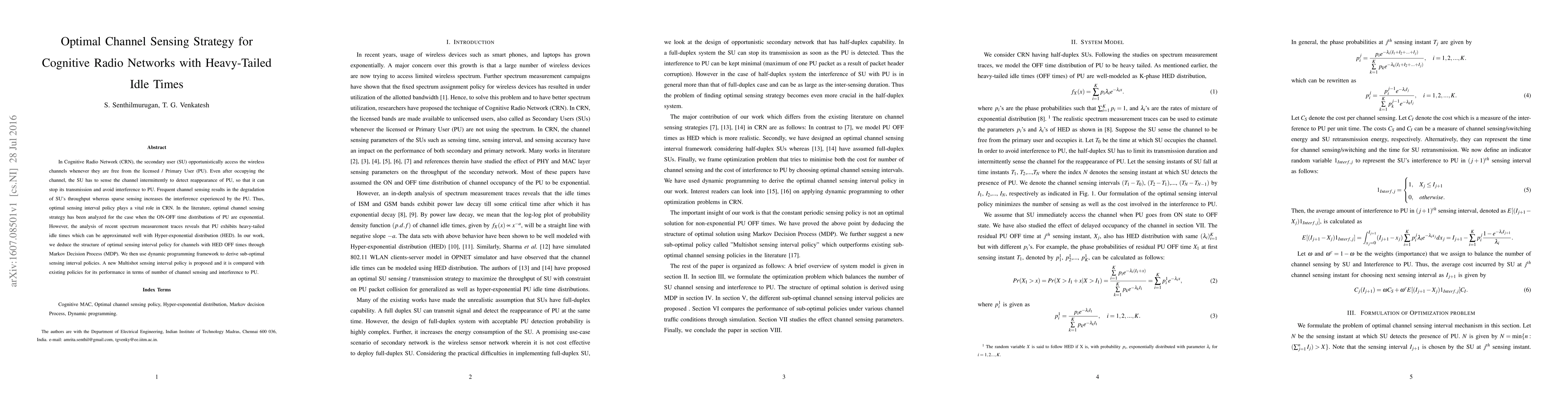This paper develops an optimal channel sensing strategy for Cognitive Radio Networks where the Primary User's idle times follow a Hyper-exponential distribution, using Markov Decision Process and dynamic programming. A new Multishot sensing interval policy is proposed and evaluated against existing policies for performance in terms of sensing frequency and interference.