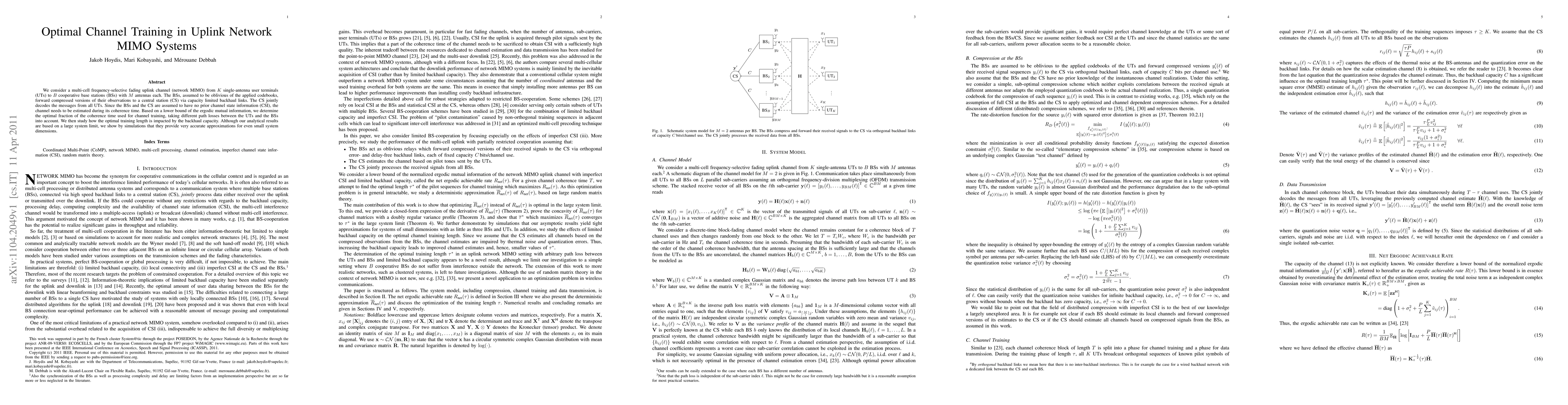 We consider a multi-cell frequency-selective fading uplink channel (network MIMO) from K single-antenna user terminals (UTs) to B cooperative base stations (BSs) with M antennas each. The BSs, assumed to be oblivious of the applied codebooks, forward compressed versions of their observations to a central station (CS) via capacity limited backhaul links. The CS jointly decodes the messages from all UTs. Since the BSs and the CS are assumed to have no prior channel state information (CSI), the channel needs to be estimated during its coherence time. Based on a lower bound of the ergodic mutual information, we determine the optimal fraction of the coherence time used for channel training, taking different path losses between the UTs and the BSs into account. We then study how the optimal training length is impacted by the backhaul capacity. Although our analytical results are based on a large system limit, we show by simulations that they provide very accurate approximations for even small system dimensions.