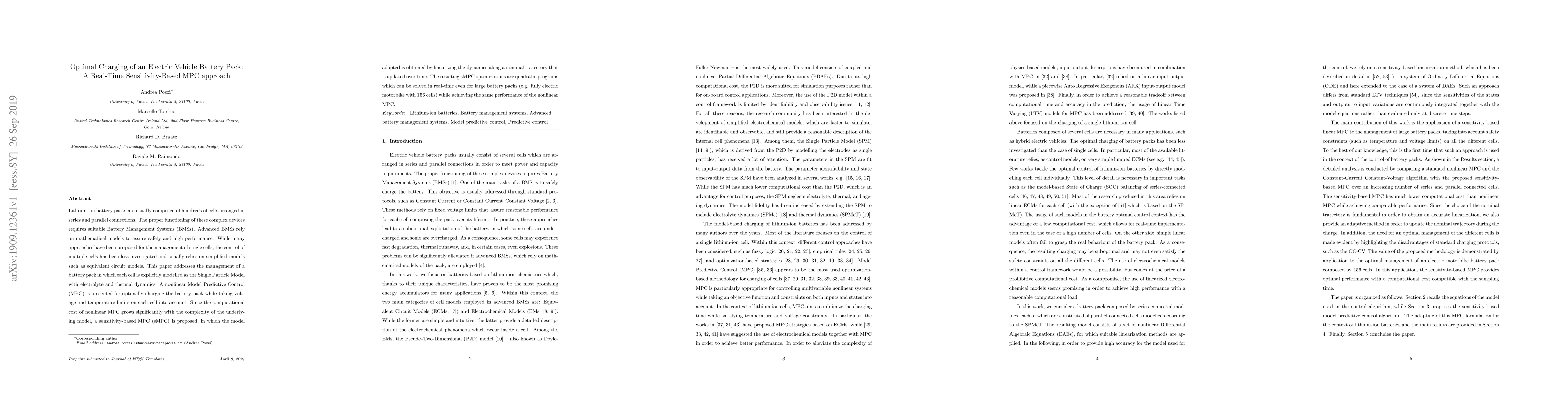 Lithium-ion battery packs are usually composed of hundreds of cells arranged in series and parallel connections. The proper functioning of these complex devices requires suitable Battery Management Systems (BMSs). Advanced BMSs rely on mathematical models to assure safety and high performance. While many approaches have been proposed for the management of single cells, the control of multiple cells has been less investigated and usually relies on simplified models such as equivalent circuit models. This paper addresses the management of a battery pack in which each cell is explicitly modelled as the Single Particle Model with electrolyte and thermal dynamics. A nonlinear Model Predictive Control (MPC) is presented for optimally charging the battery pack while taking voltage and temperature limits on each cell into account. Since the computational cost of nonlinear MPC grows significantly with the complexity of the underlying model, a sensitivity-based MPC (sMPC) is proposed, in which the model adopted is obtained by linearizing the dynamics along a nominal trajectory that is updated over time. The resulting sMPC optimizations are quadratic programs which can be solved in real-time even for large battery packs (e.g. fully electric motorbike with 156 cells) while achieving the same performance of the nonlinear MPC.
