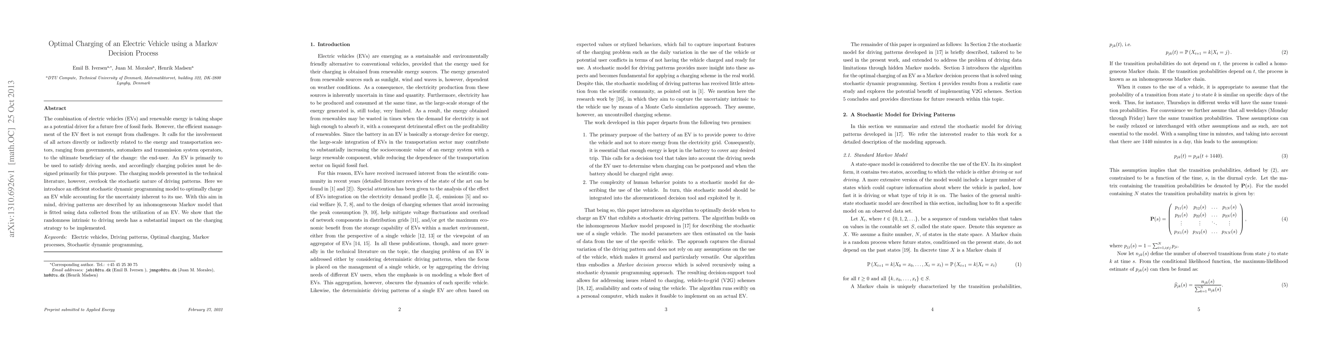 The model uses an inhomogeneous Markov model fitted to real-world data from an electric vehicle, showing that random driving needs can significantly affect optimal charging policies.
