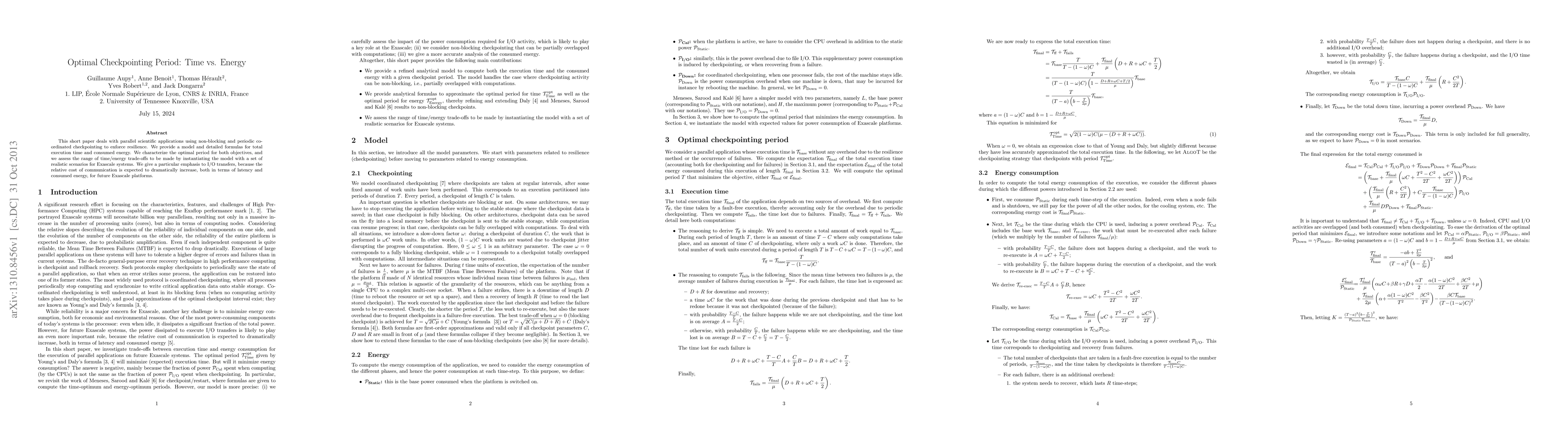 This short paper deals with parallel scientific applications using non-blocking and periodic coordinated checkpointing to enforce resilience. We provide a model and detailed formulas for total execution time and consumed energy. We characterize the optimal period for both objectives, and we assess the range of time/energy trade-offs to be made by instantiating the model with a set of realistic scenarios for Exascale systems. We give a particular emphasis to I/O transfers, because the relative cost of communication is expected to dramatically increase, both in terms of latency and consumed energy, for future Exascale platforms.