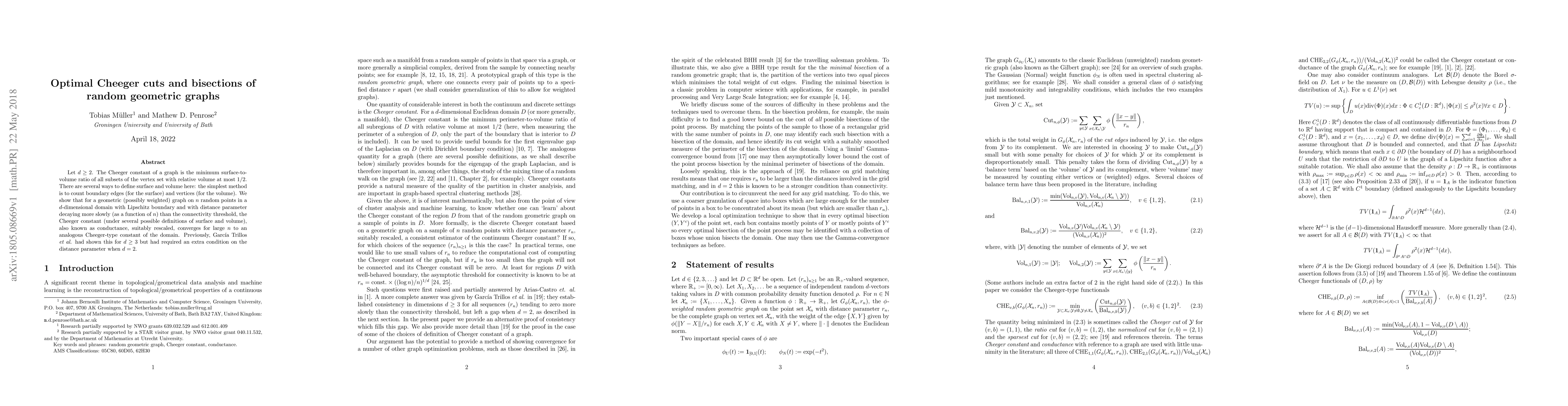 A research paper shows that for large random geometric graphs with certain properties, their Cheeger constant converges to a similar constant of the underlying domain as the number of points increases.