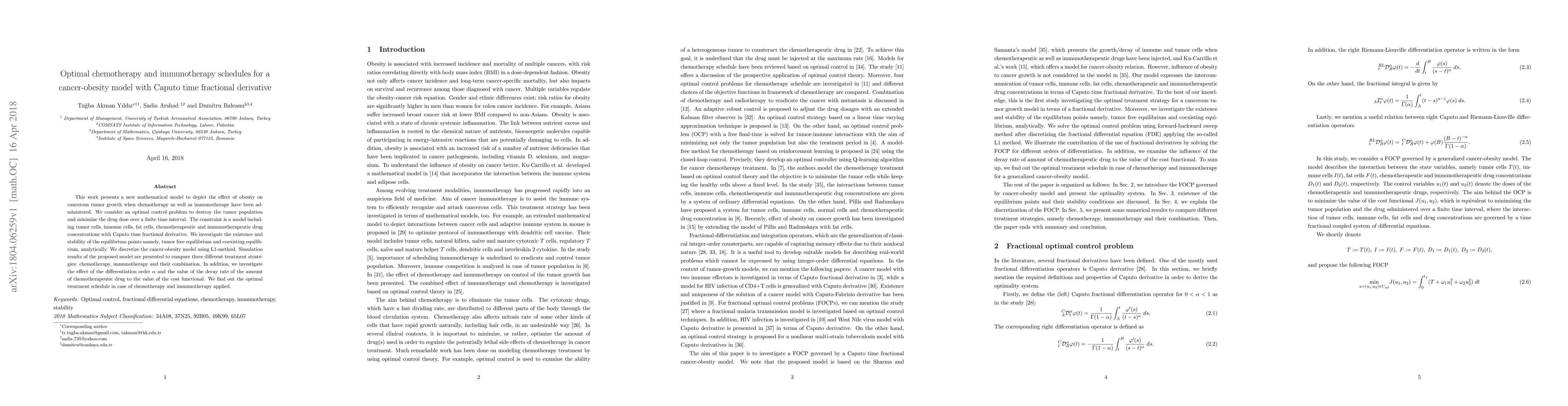 This study develops a new model to analyze how obesity affects cancer treatment outcomes, using Caputo time fractional derivative, and finds optimal chemotherapy and immunotherapy schedules for minimizing drug doses.