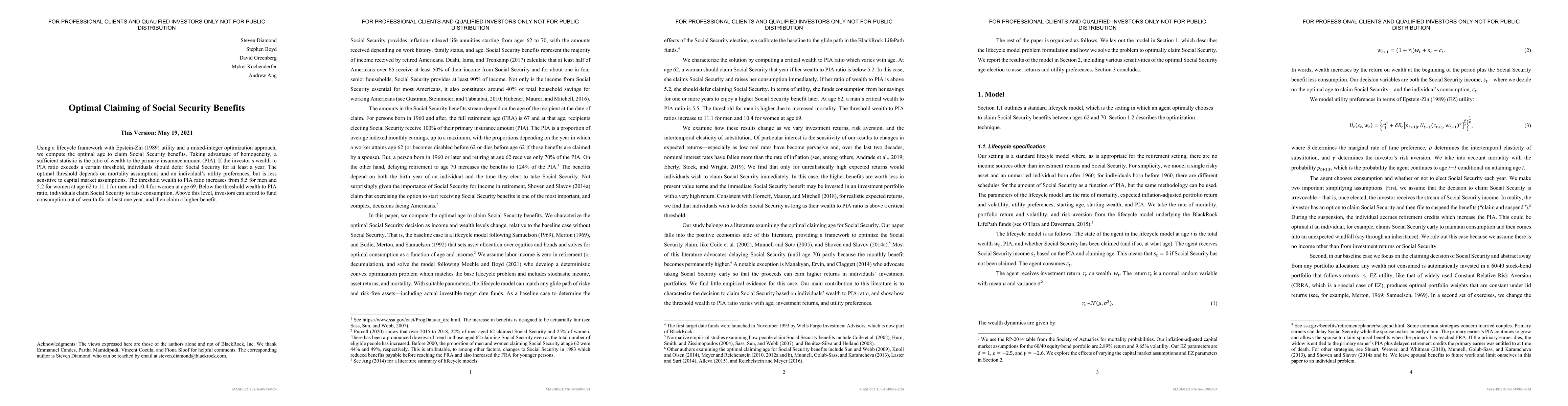 This research calculates the optimal age to claim Social Security benefits using a lifecycle framework and Epstein-Zin utility. The key finding is that individuals should defer benefits if their wealth to Primary Insurance Amount (PIA) ratio surpasses a specific threshold, dependent on mortality assumptions and utility preferences. This threshold rises from 5.5 for men and 5.2 for women at age 62 to 11.1 for men and 10.4 for women at age 69. Below this threshold, claiming benefits boosts consumption; above, wealth can sustain consumption, allowing for a higher benefit.