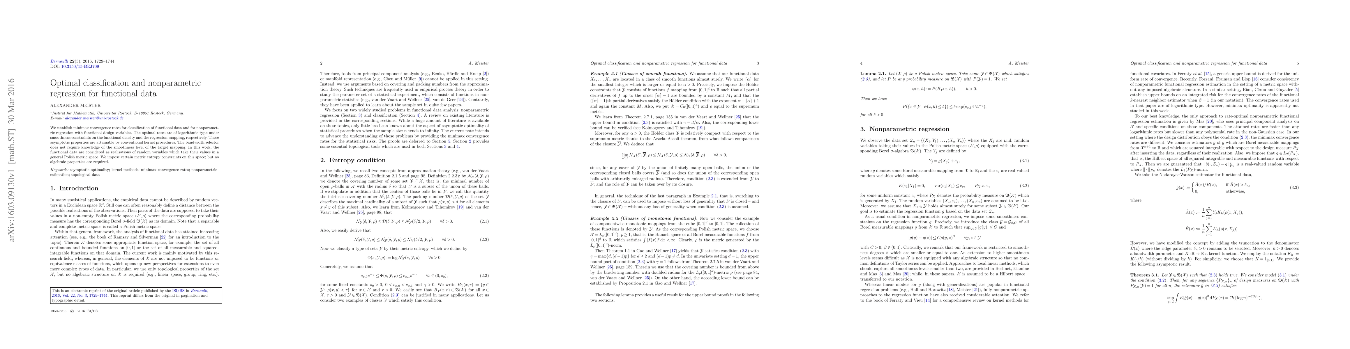 We establish minimax convergence rates for classification of functional data and for nonparametric regression with functional design variables. The optimal rates are of logarithmic type under smoothness constraints on the functional density and the regression mapping, respectively. These asymptotic properties are attainable by conventional kernel procedures. The bandwidth selector does not require knowledge of the smoothness level of the target mapping. In this work, the functional data are considered as realisations of random variables which take their values in a general Polish metric space. We impose certain metric entropy constraints on this space; but no algebraic properties are required.
