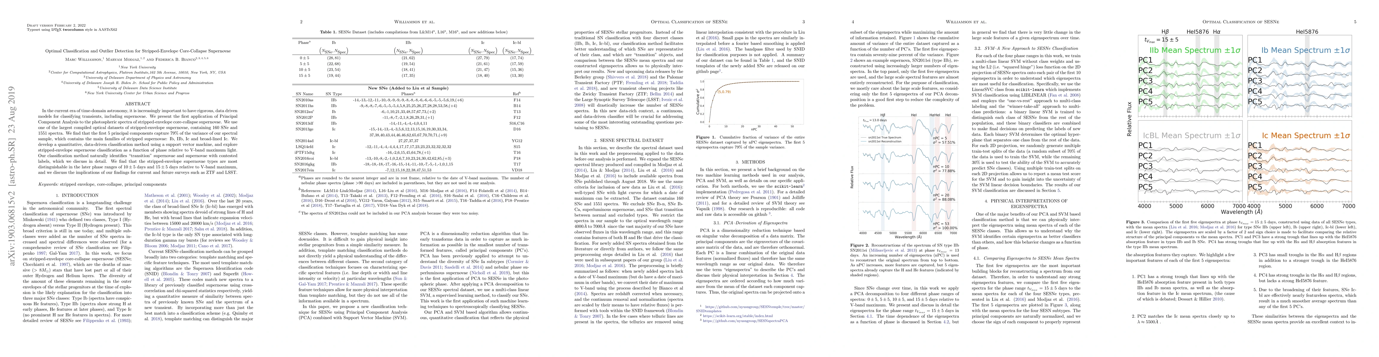 This paper applies Principal Component Analysis to classify stripped-envelope core-collapse supernovae using a large optical dataset, finding that 5 principal components capture 79% of variance. A support vector machine classification method identifies distinct supernova types, especially distinguishable in later phases around 10-15 days post-maximum light.