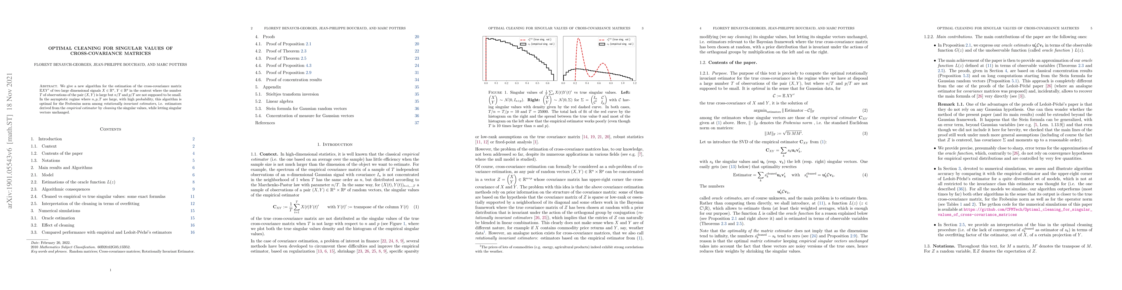 This paper introduces a new algorithm for estimating the cross-covariance matrix of two high-dimensional signals, which is optimal for the Frobenius norm under the condition that the number of observations is large but the dimensions of the signals are not small relative to the observations. The algorithm optimally cleans the singular values while preserving the singular vectors.