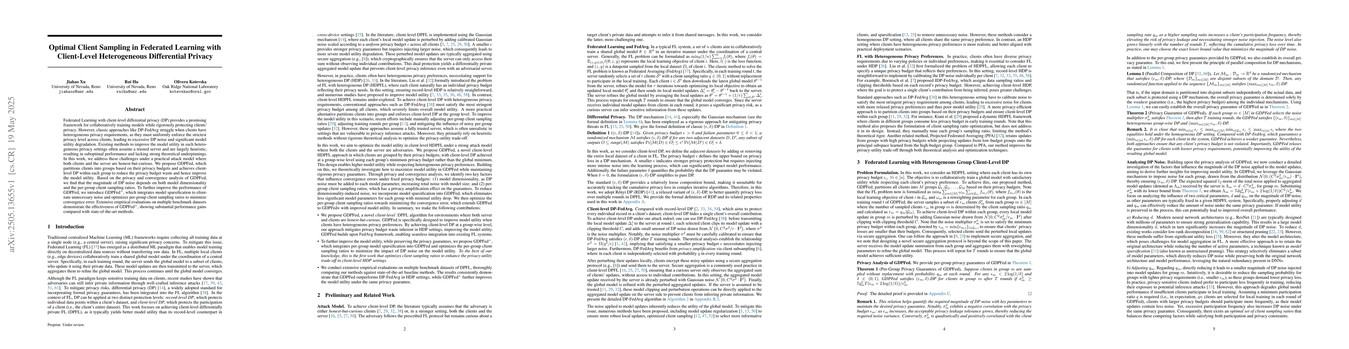 This work stands out by providing a theoretically grounded approach to client-level DP in federated learning, addressing heterogeneous privacy needs without relying on a trusted server, and offering performance improvements through model sparsification and optimized sampling.