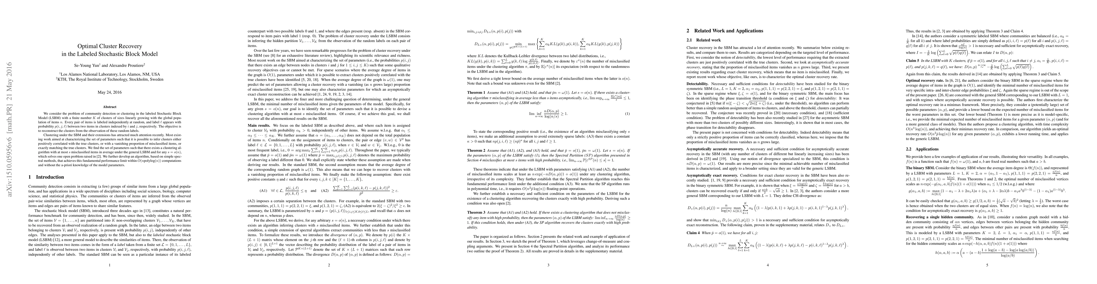 We consider the problem of community detection or clustering in the labeled Stochastic Block Model (LSBM) with a finite number $K$ of clusters of sizes linearly growing with the global population of items $n$. Every pair of items is labeled independently at random, and label $\ell$ appears with probability $p(i,j,\ell)$ between two items in clusters indexed by $i$ and $j$, respectively. The objective is to reconstruct the clusters from the observation of these random labels. Clustering under the SBM and their extensions has attracted much attention recently. Most existing work aimed at characterizing the set of parameters such that it is possible to infer clusters either positively correlated with the true clusters, or with a vanishing proportion of misclassified items, or exactly matching the true clusters. We find the set of parameters such that there exists a clustering algorithm with at most $s$ misclassified items in average under the general LSBM and for any $s=o(n)$, which solves one open problem raised in \cite{abbe2015community}. We further develop an algorithm, based on simple spectral methods, that achieves this fundamental performance limit within $O(n \mbox{polylog}(n))$ computations and without the a-priori knowledge of the model parameters.