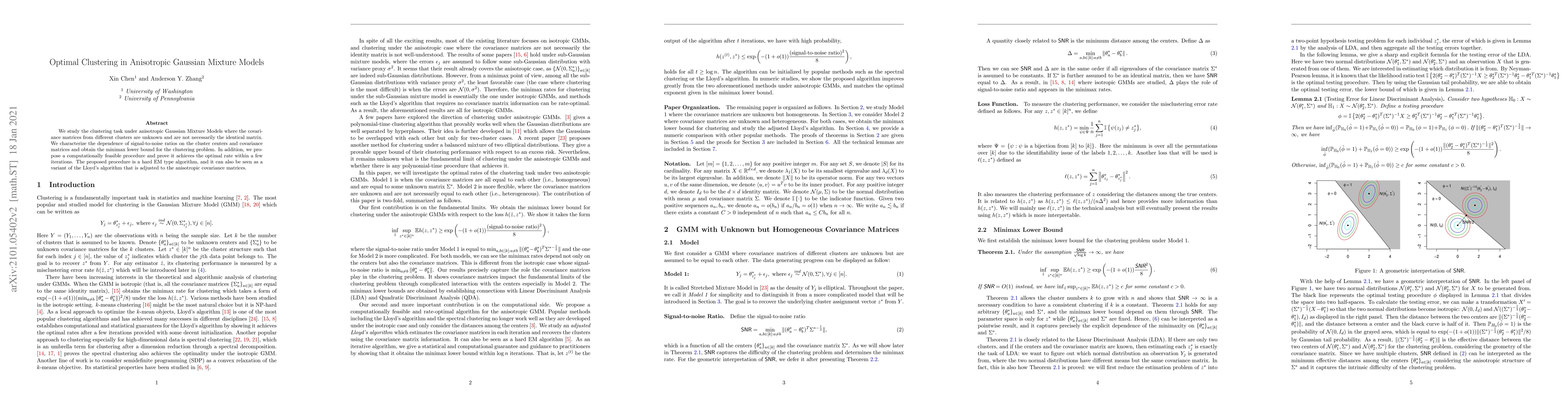 This paper investigates clustering in anisotropic Gaussian Mixture Models, deriving the minimax lower bound for the problem and proposing an optimal, computationally feasible hard EM-type algorithm that achieves this bound within a few iterations. The algorithm is a variant of Lloyd's algorithm adapted for anisotropic covariance matrices.