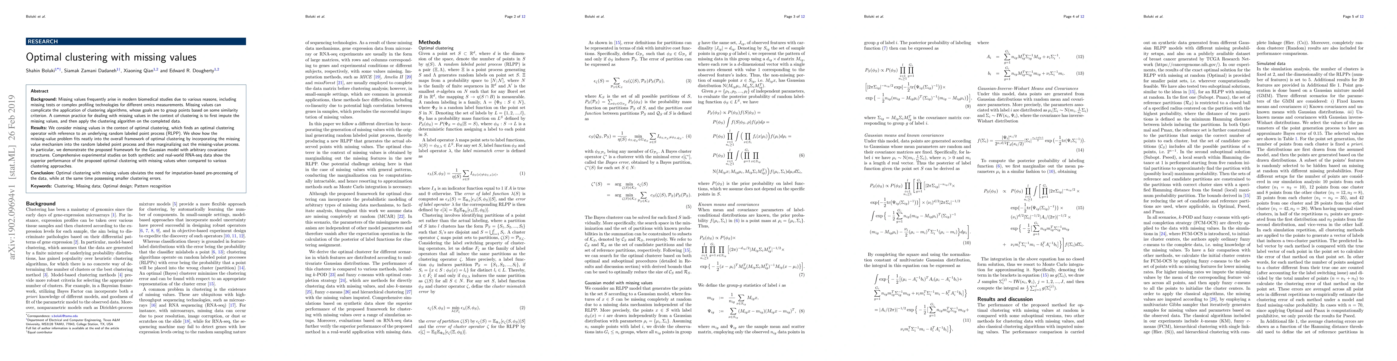 This paper proposes a framework for optimal clustering that directly handles missing values without imputation, integrating the missing value mechanism into the random labeled point process and marginalizing it out. Experimental results show superior performance on both synthetic and real RNA-seq data compared to traditional clustering methods.