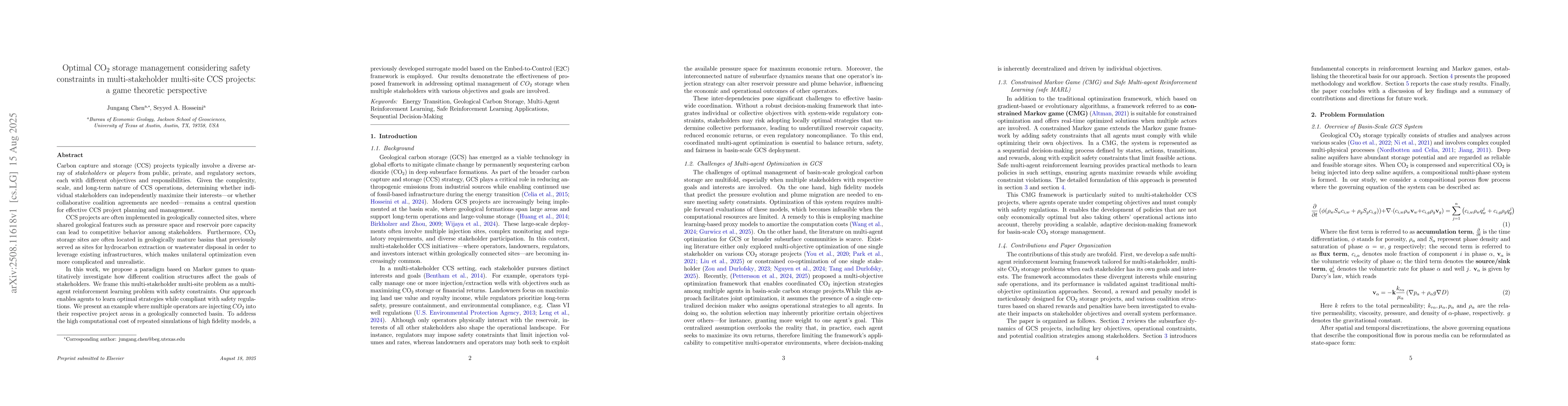Carbon capture and storage (CCS) projects typically involve a diverse array of stakeholders or players from public, private, and regulatory sectors, each with different objectives and responsibilities. Given the complexity, scale, and long-term nature of CCS operations, determining whether individual stakeholders can independently maximize their interests or whether collaborative coalition agreements are needed remains a central question for effective CCS project planning and management. CCS projects are often implemented in geologically connected sites, where shared geological features such as pressure space and reservoir pore capacity can lead to competitive behavior among stakeholders. Furthermore, CO2 storage sites are often located in geologically mature basins that previously served as sites for hydrocarbon extraction or wastewater disposal in order to leverage existing infrastructures, which makes unilateral optimization even more complicated and unrealistic. In this work, we propose a paradigm based on Markov games to quantitatively investigate how different coalition structures affect the goals of stakeholders. We frame this multi-stakeholder multi-site problem as a multi-agent reinforcement learning problem with safety constraints. Our approach enables agents to learn optimal strategies while compliant with safety regulations. We present an example where multiple operators are injecting CO2 into their respective project areas in a geologically connected basin. To address the high computational cost of repeated simulations of high-fidelity models, a previously developed surrogate model based on the Embed-to-Control (E2C) framework is employed. Our results demonstrate the effectiveness of the proposed framework in addressing optimal management of CO2 storage when multiple stakeholders with various objectives and goals are involved.
