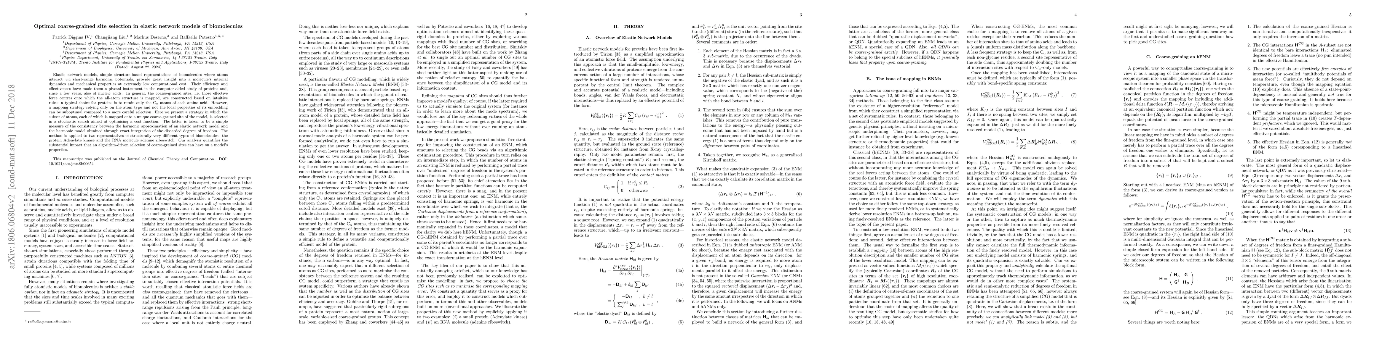 This paper presents a method for optimally selecting coarse-grained sites in elastic network models of biomolecules, aiming to improve the consistency between the simplified model and the full atomistic dynamics. The approach is applied to Adenylate kinase and adenine riboswitch, demonstrating significant enhancements in model accuracy over traditional selection strategies.
