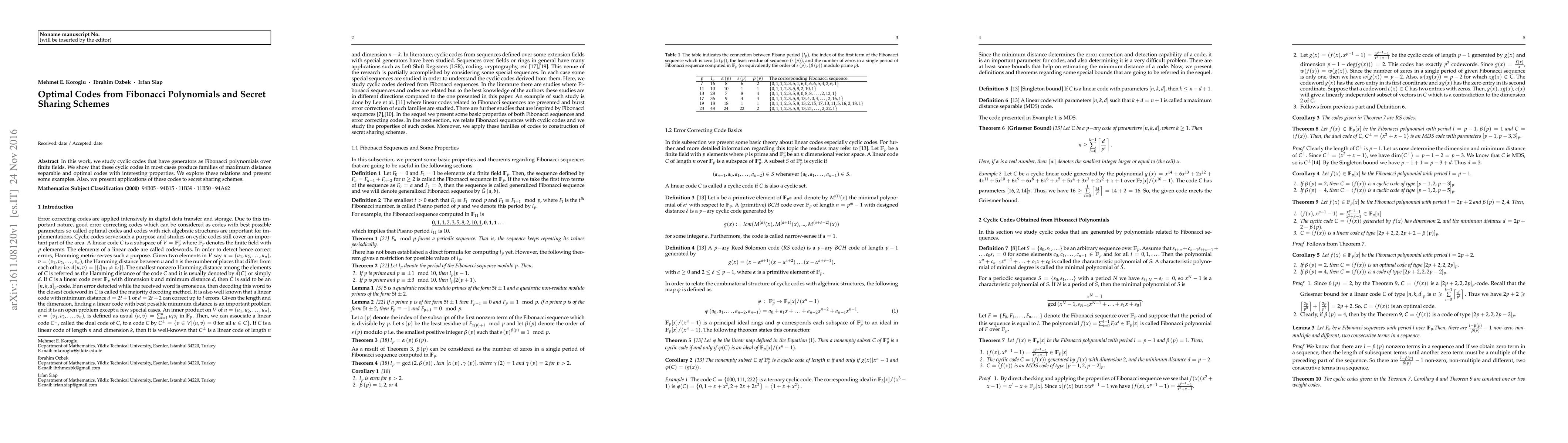 This study investigates cyclic codes generated by Fibonacci polynomials over finite fields, demonstrating their potential to produce optimal, maximum distance separable codes with unique properties. The research also applies these codes to enhance secret sharing schemes.