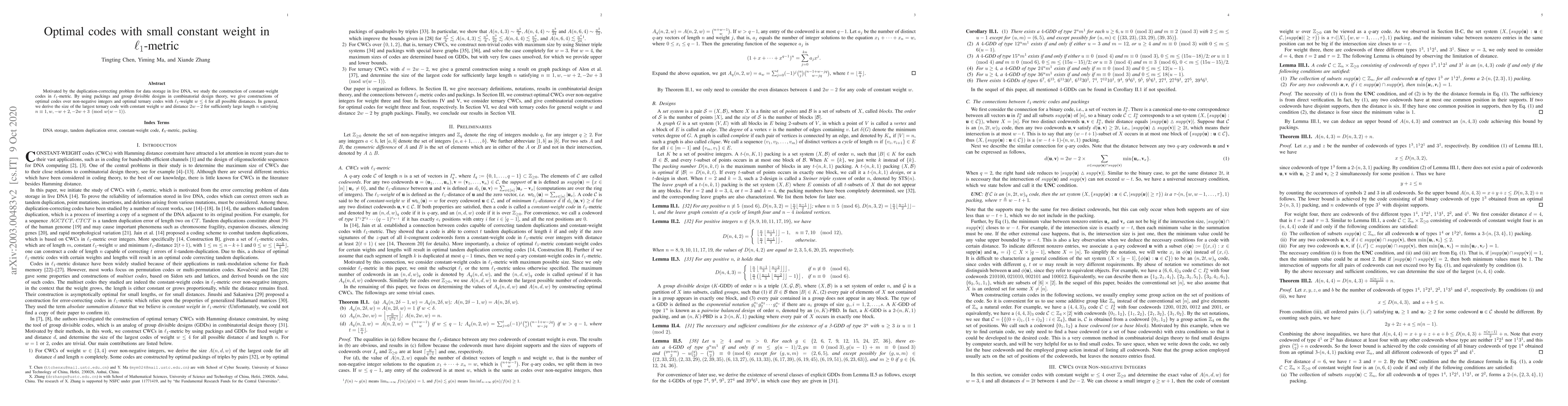 Researchers construct optimal codes with small constant weight in a specific metric, enabling efficient data storage in live DNA, and derive the size of largest ternary code for certain distances and weights.