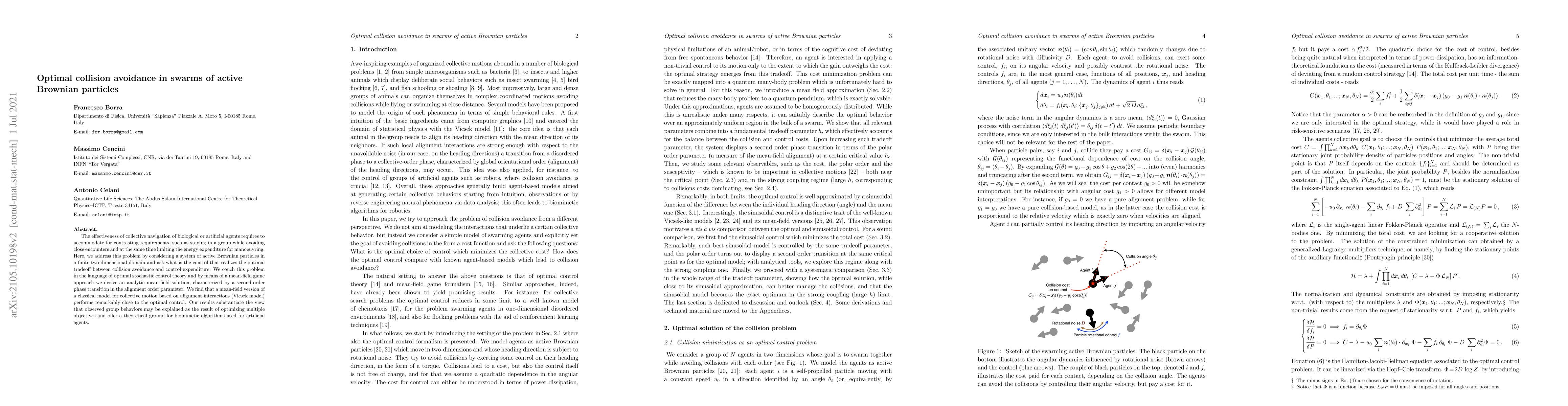 Researchers developed a model for optimal collision avoidance in swarms of active Brownian particles, finding that a mean-field version of the Vicsek model achieves remarkably close results to the optimal control. The study offers a theoretical ground for biomimetic algorithms used in artificial agents.