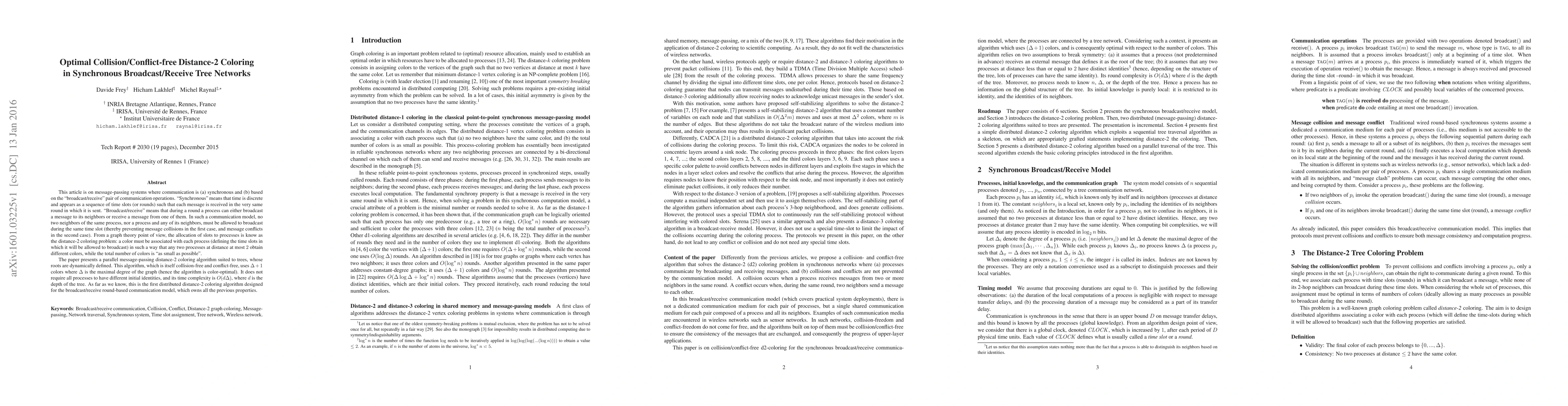 This article is on message-passing systems where communication is (a) synchronous and (b) based on the "broadcast/receive" pair of communication operations. "Synchronous" means that time is discrete and appears as a sequence of time slots (or rounds) such that each message is received in the very same round in which it is sent. "Broadcast/receive" means that during a round a process can either broadcast a message to its neighbors or receive a message from one of them. In such a communication model, no two neighbors of the same process, nor a process and any of its neighbors, must be allowed to broadcast during the same time slot (thereby preventing message collisions in the first case, and message conflicts in the second case). From a graph theory point of view, the allocation of slots to processes is know as the distance-2 coloring problem: a color must be associated with each process (defining the time slots in which it will be allowed to broadcast) in such a way that any two processes at distance at most 2 obtain different colors, while the total number of colors is "as small as possible". The paper presents a parallel message-passing distance-2 coloring algorithm suited to trees, whose roots are dynamically defined. This algorithm, which is itself collision-free and conflict-free, uses $\Delta + 1$ colors where $\Delta$ is the maximal degree of the graph (hence the algorithm is color-optimal). It does not require all processes to have different initial identities, and its time complexity is $O(d \Delta)$, where d is the depth of the tree. As far as we know, this is the first distributed distance-2 coloring algorithm designed for the broadcast/receive round-based communication model, which owns all the previous properties.